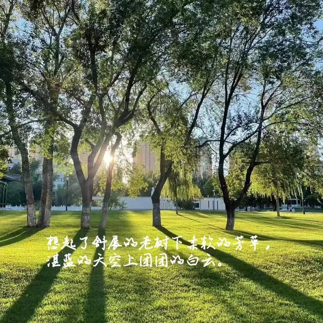 想起了舒展的老树下柔软的芳草,湛蓝的天空上团团的白云。