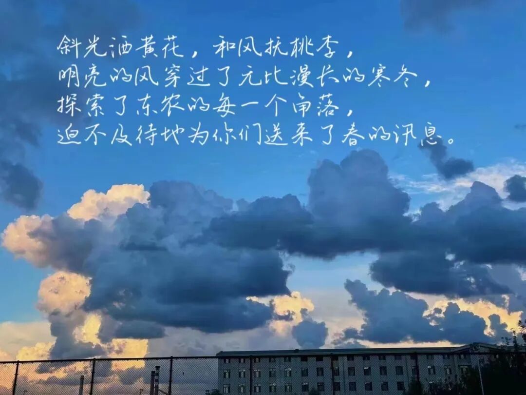 斜光洒黄花,和风抚桃李,明亮的风穿过了无比漫长的寒冬,探索了东农的每一个角落,迫不及待地为你们送来了春的讯息。