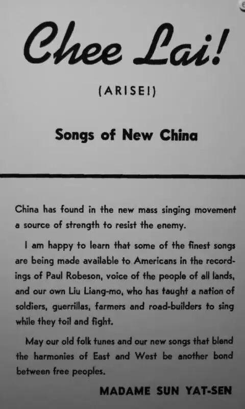 这位正在唱歌的歌手名叫保罗·罗伯逊是美国人。他的英文版专辑《起来:新中国之歌》(Chee-Lai Songs of New China),由宋庆龄亲自做序: