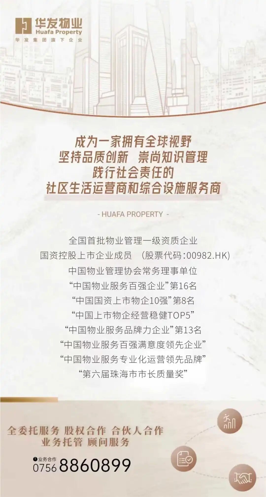 乘势而上勇破局,聚力前行谋新篇。高质量发展,是华发物业2023年上半年最鲜明的底色,也是最高昂的主题。我们将继续沿着“文化引领、品质助力、高质量发展”的总体发展思路,增强凝聚力,提升服务力,书写更加美好的华发物业新篇章。