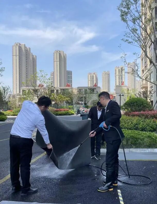 管理处为此次活动准备了专业清洗工具:高压水枪、清洁泡沫、海绵、擦车布......物业人员撸起袖子、穿上雨鞋,为业主的爱车喷洒上清洁泡沫,用抹布仔细地给每台车“搓澡”;又接过一块块地垫,重复操作着倒淋洗剂、洗刷、水枪冲水、晾晒等程序。在大家的共同努力下,活动至今,管理处共清洗了110辆车辆、60余块地垫,让业主的爱车能够焕然一新,闪亮出行。