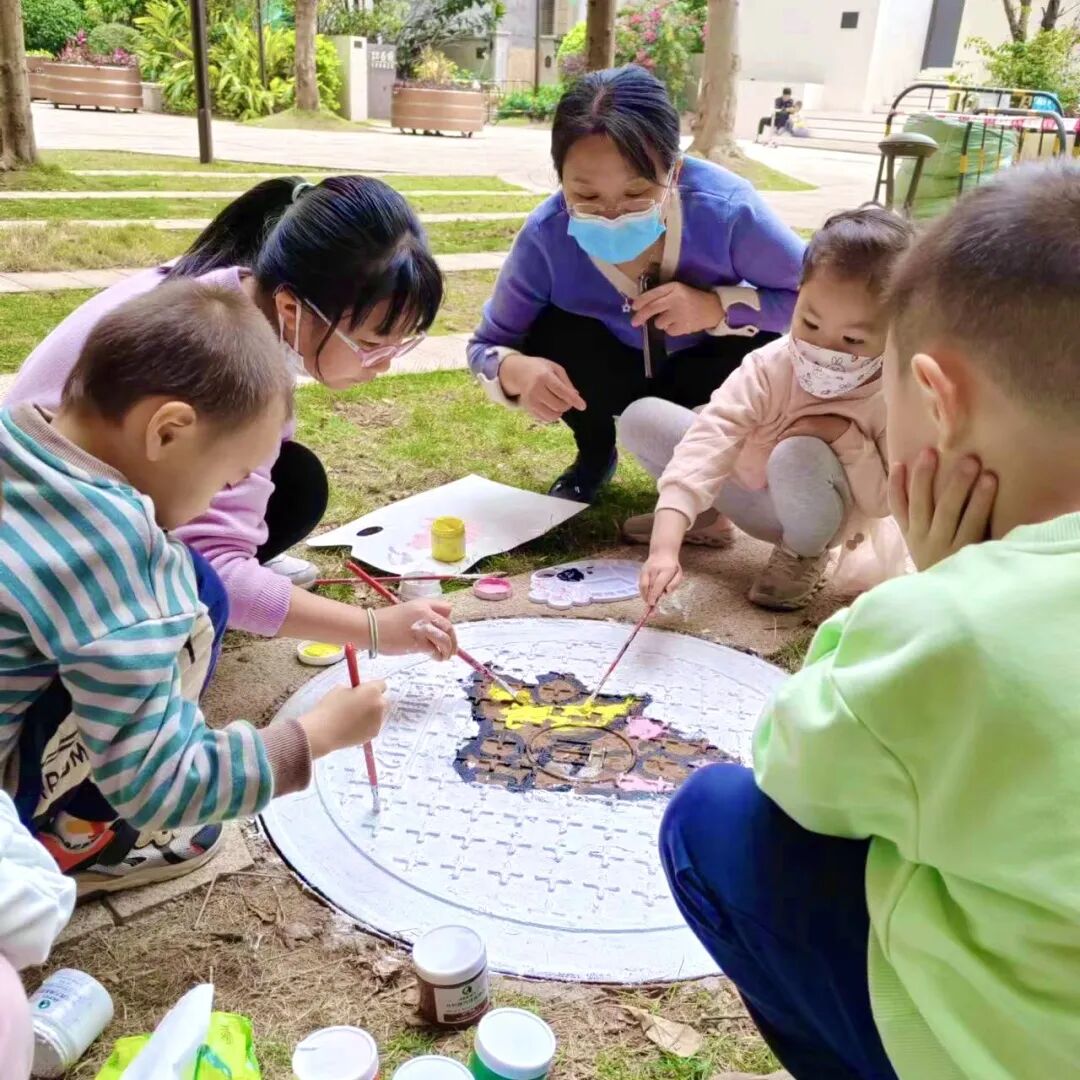 在物业管理处人员简单清理井盖后,华发尚座花园的业主小朋友们便提笔开始绘画。大家充分发挥想象力,大胆运用颜料和画笔,在圆圆的井盖上画出生动形象的创意绘画。随着颜料和笔触落到一个个井盖上,暗沉沉的井盖在颜色的点缀下成了一道靓丽的风景线。管理处的工作人员则在一旁给孩子们充当助手,不时帮忙传递颜料,不时给出建议指导,通力合作完成图案创作及填色,让小区里原本沉寂的井盖增添了色彩活力。