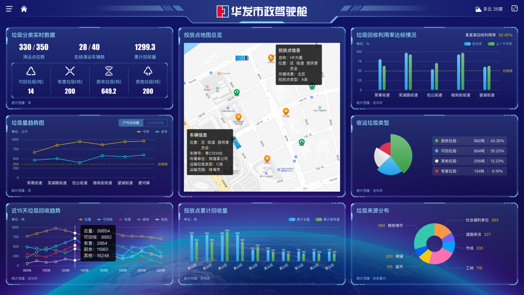 华发市政依托公司智慧环卫集成指挥系统,充分运用现代物联网、移动互联网、大数据、云计算等相关技术迭代升级,打造“垃圾分类全生命周期智能监管平台”,对垃圾分类所涉及的人、车、设施设备、居民小区、社会单位、组织机构等多个主体进行全过程实时管理,可收集垃圾分类工作监管的各类信息,并具有身份识别、位置感知、重量感知、图像感知、状态感知等能力,有效提高垃圾分类精细化、智慧化管理水平,降低环卫运营成本。