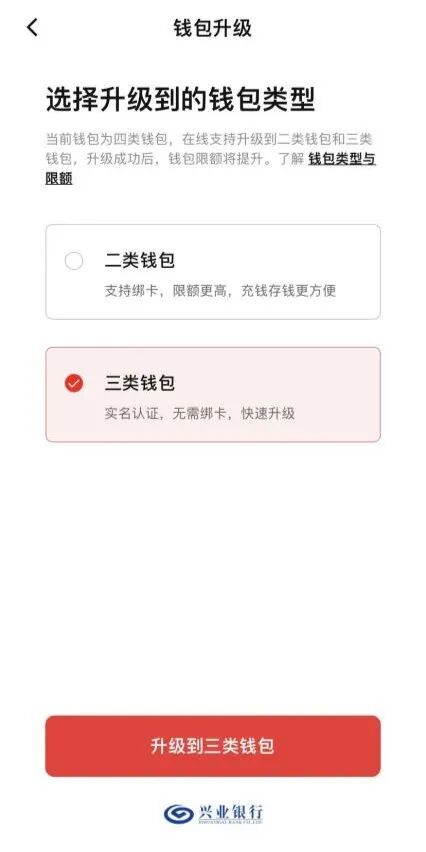 打开兴业银行数字钱包,“首页”翻转→“钱包管理”→“钱包升级”到三类钱包或二类钱包。