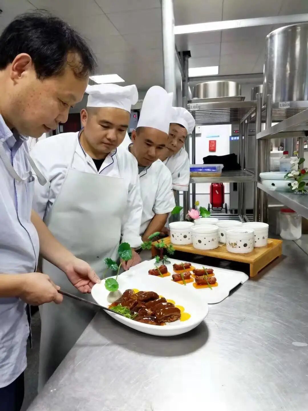 他还不定期带领骨干厨师前往校外餐饮同行、兄弟院校学习菜品制作,旨在打造一支善于学习、勇于创新的技术队伍。
