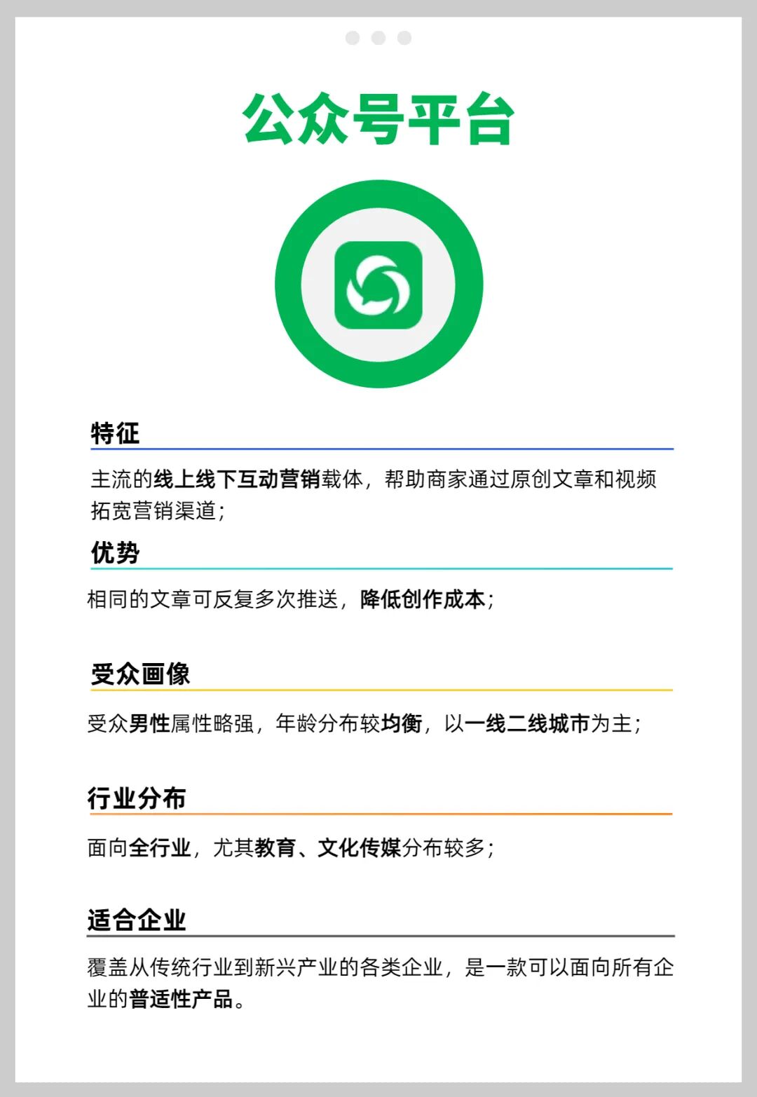 这种类型的跨平台组合适合有销售需求、以市场营销为导向搭建账号矩阵的企业,在像抖音这类的流量平台宣传企业产品和服务,提高品牌曝光,再引流到公众号或视频号,通过输出更为核心专业的内容,加强用户的认知,提高转化。