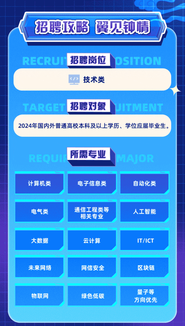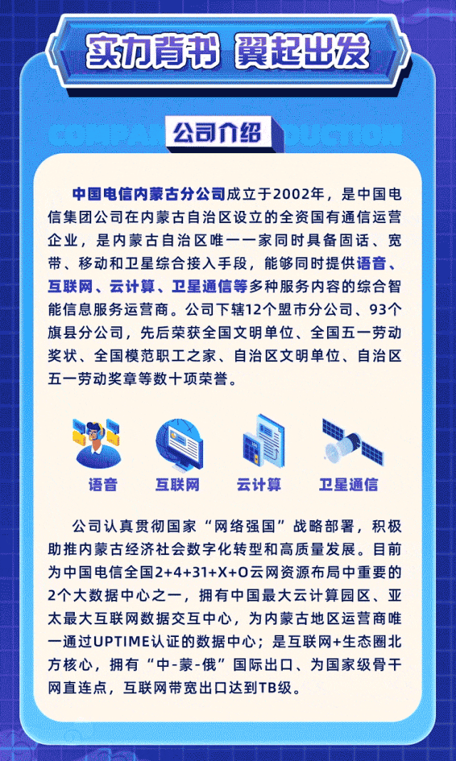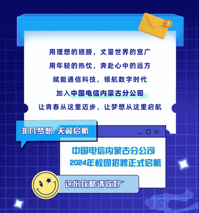 文章内容来源于公众号:中国电信校园招聘,点此可查看原文,内容版权归相关企业所有,本网站仅供交流学习。若涉及版权问题或存在侵权情况,请及时与我们联系,我们将第一时间进行删除处理。