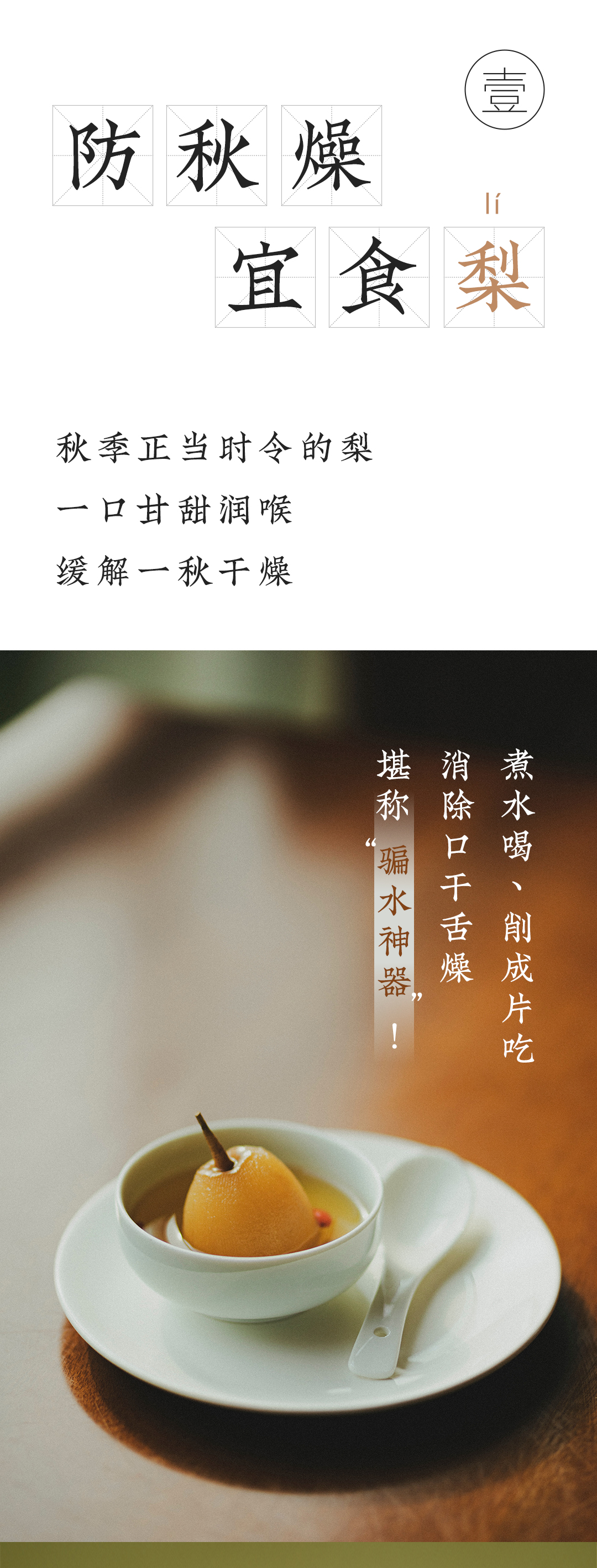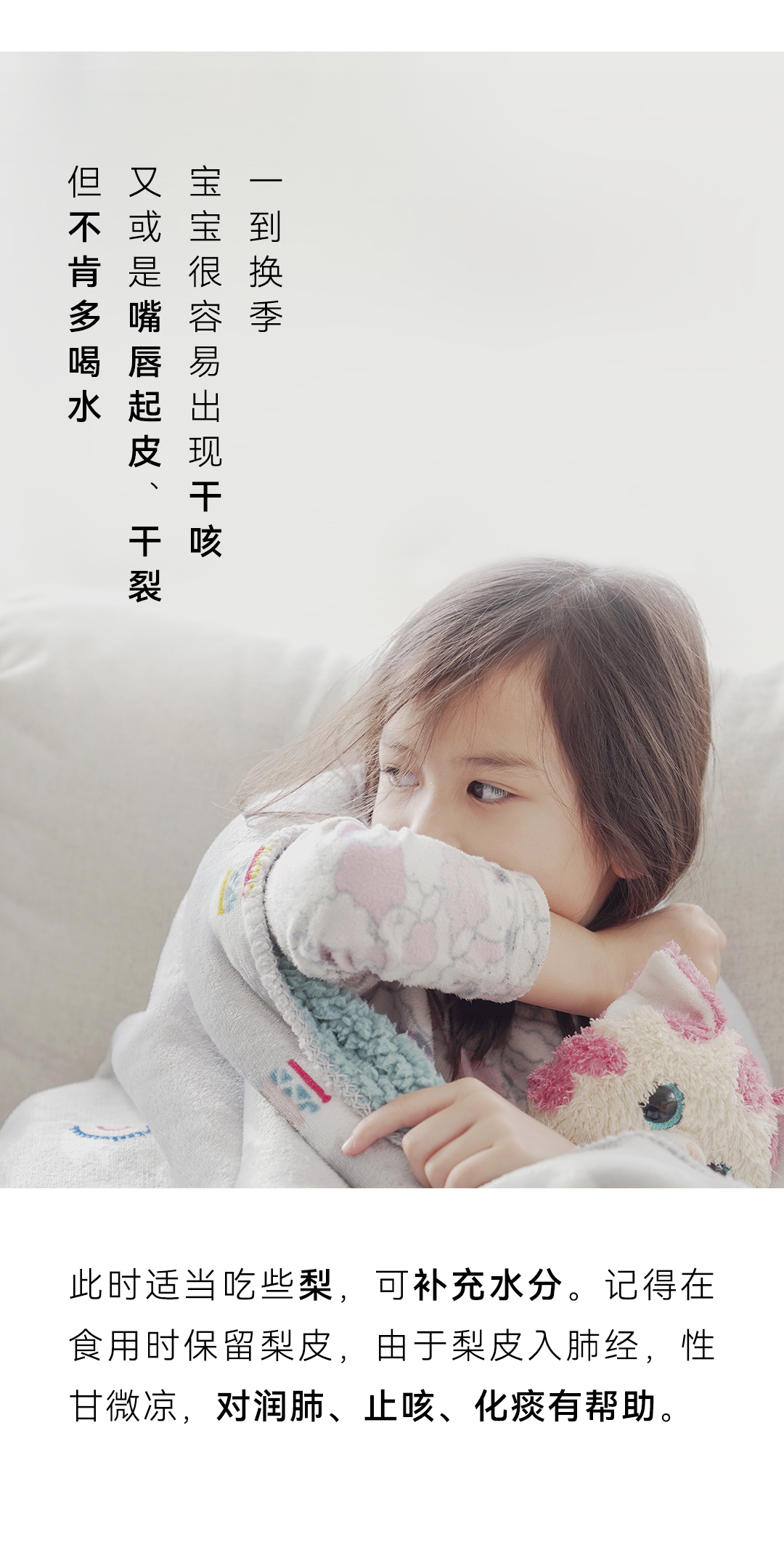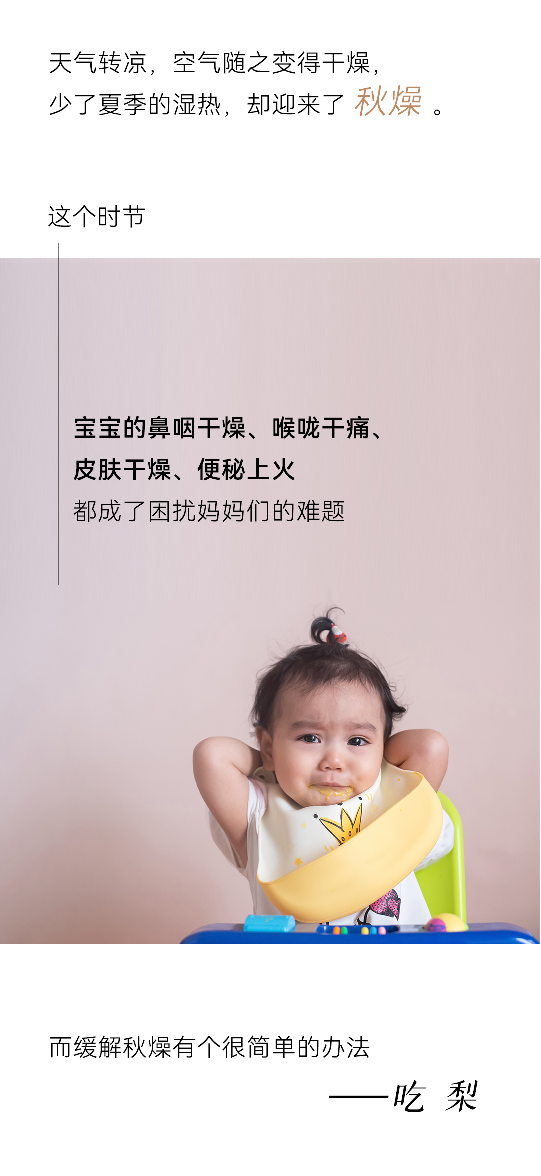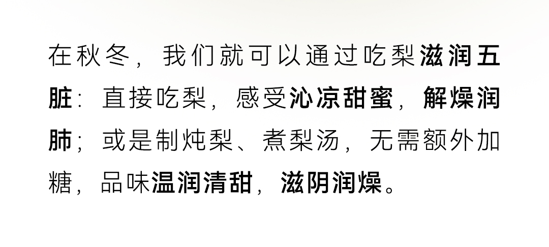 「秋,始于白露前一周,终于立冬后四天,主燥。」天气转凉,空气随之变得干燥,少了夏季的湿热,却迎来了秋燥。这个时节,宝宝的鼻咽干燥、喉咙干痛、皮肤干燥、便秘上火,都成了困扰妈妈们的难题。而缓解秋燥有个很简单的办法——吃梨。防秋燥 宜食梨秋季正当时令的梨,一口甘甜润喉,缓解一秋干燥。煮水喝、削成片吃,消除口干舌燥堪称“骗水神器”!梨味甘,微酸,性寒,无毒润肺凉心,消痰止嗽——源自《本草纲目》在秋冬,我们就可以通过吃梨滋润五脏:直接吃梨,感受沁凉甜蜜,解燥润肺;或是制炖梨、煮梨汤,无需额外加糖,品味温润清甜,滋阴润燥。一到换季,宝宝很容易出现干咳,又或是嘴唇起皮、干裂但不肯多喝水,此时适当吃些梨,可补充水分。记得在食用时保留梨皮,由于梨皮入肺经,性甘微凉,对润肺、止咳、化痰有帮助。梨虽好,却始终是寒凉之物《本草衍义》记载:“梨,多食则动脾,少则不及病”,意思是,梨多吃了容易妨碍脾胃功能,少了又没效果,脾胃功能弱的宝宝,更不宜多食。为缓和梨的寒凉作用,可以适当补充养护脾胃的食物。健脾胃 用山药铁棍山药味甘,性平,无毒补脾养胃,生津益肺——源自《中国药典》