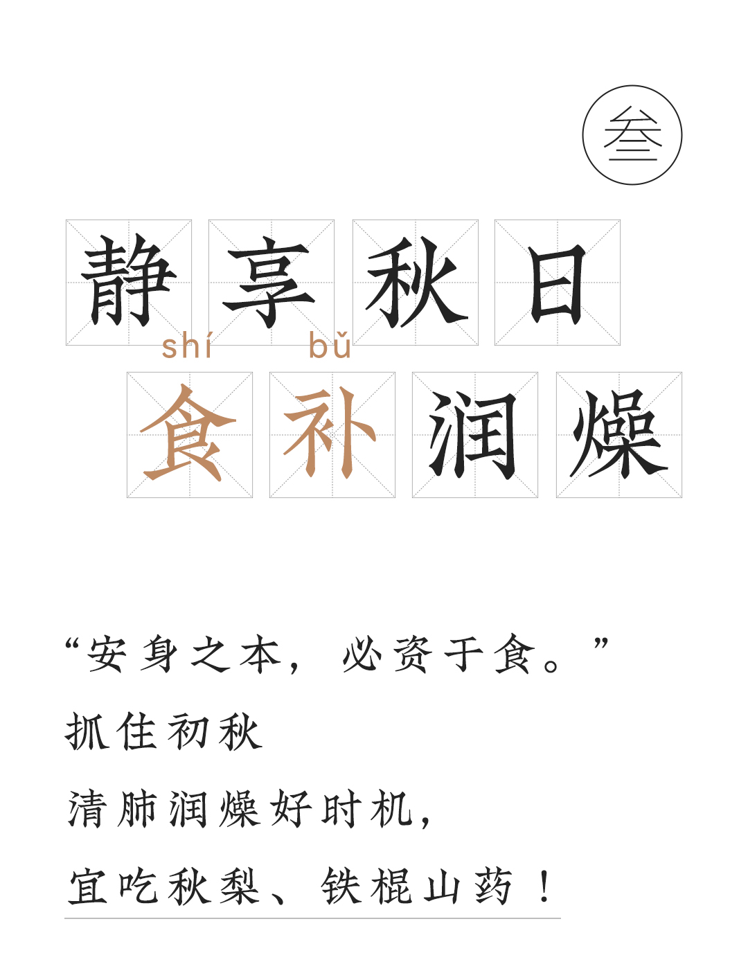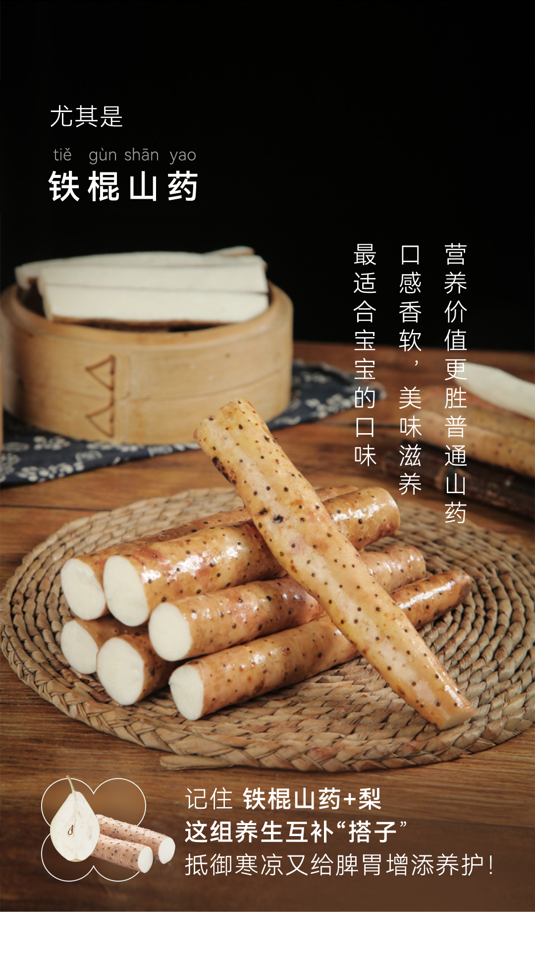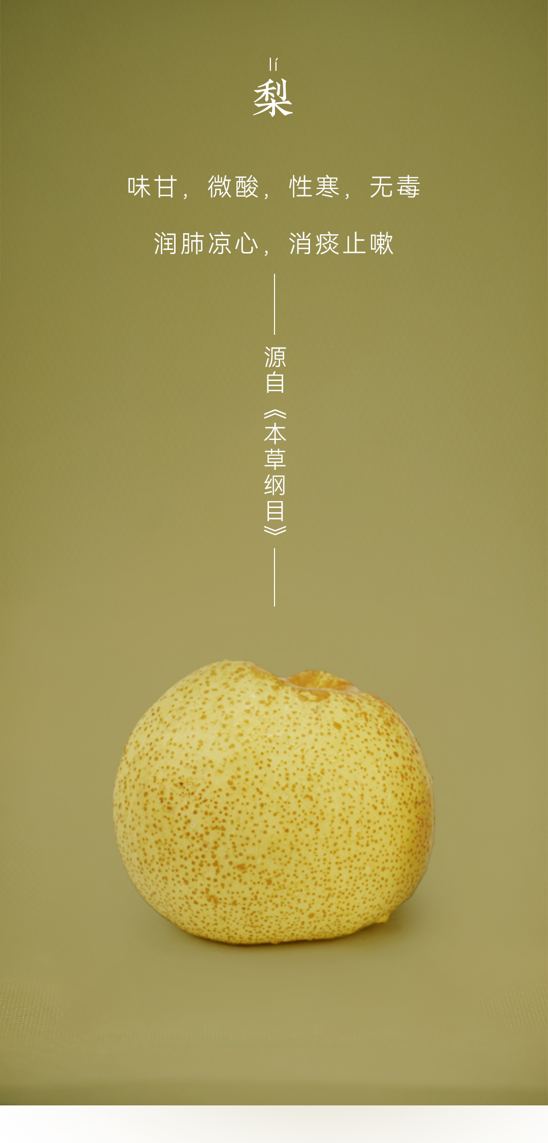 「秋,始于白露前一周,终于立冬后四天,主燥。」天气转凉,空气随之变得干燥,少了夏季的湿热,却迎来了秋燥。这个时节,宝宝的鼻咽干燥、喉咙干痛、皮肤干燥、便秘上火,都成了困扰妈妈们的难题。而缓解秋燥有个很简单的办法——吃梨。防秋燥 宜食梨秋季正当时令的梨,一口甘甜润喉,缓解一秋干燥。煮水喝、削成片吃,消除口干舌燥堪称“骗水神器”!梨味甘,微酸,性寒,无毒润肺凉心,消痰止嗽——源自《本草纲目》在秋冬,我们就可以通过吃梨滋润五脏:直接吃梨,感受沁凉甜蜜,解燥润肺;或是制炖梨、煮梨汤,无需额外加糖,品味温润清甜,滋阴润燥。一到换季,宝宝很容易出现干咳,又或是嘴唇起皮、干裂但不肯多喝水,此时适当吃些梨,可补充水分。记得在食用时保留梨皮,由于梨皮入肺经,性甘微凉,对润肺、止咳、化痰有帮助。梨虽好,却始终是寒凉之物《本草衍义》记载:“梨,多食则动脾,少则不及病”,意思是,梨多吃了容易妨碍脾胃功能,少了又没效果,脾胃功能弱的宝宝,更不宜多食。为缓和梨的寒凉作用,可以适当补充养护脾胃的食物。健脾胃 用山药铁棍山药味甘,性平,无毒补脾养胃,生津益肺——源自《中国药典》