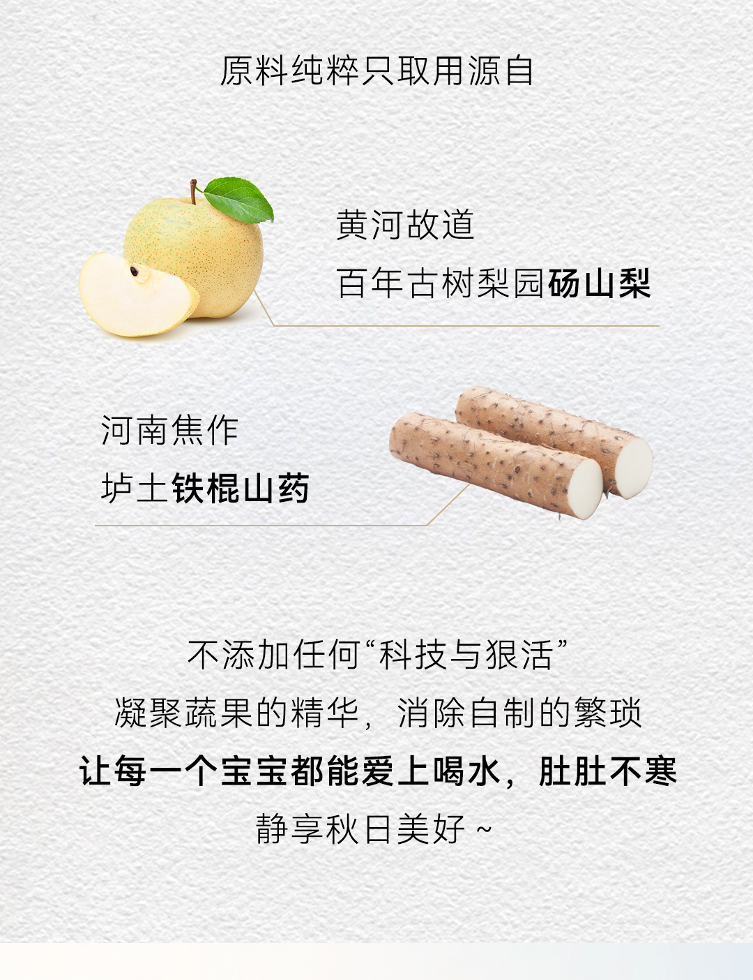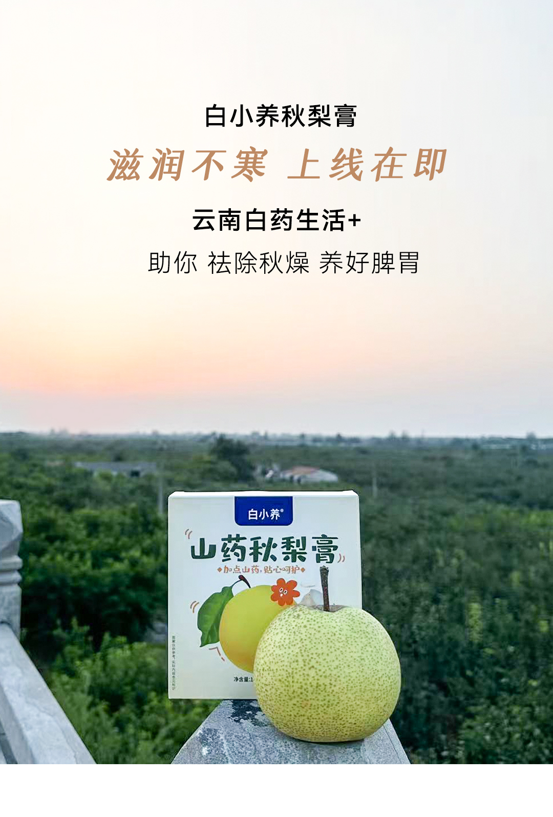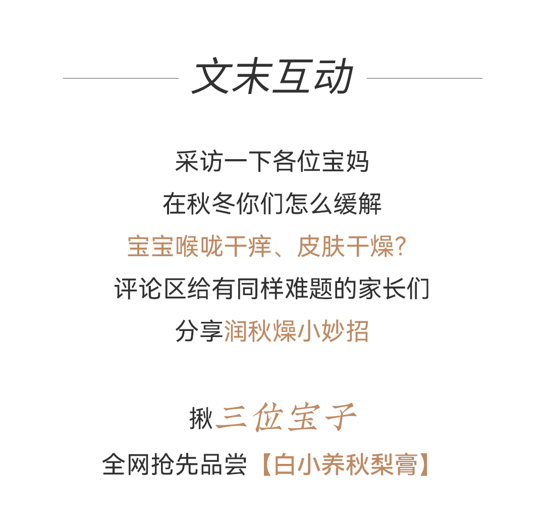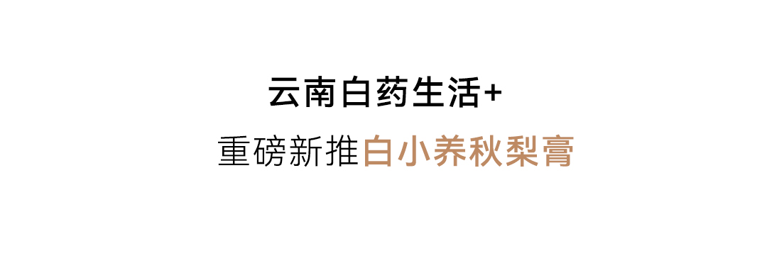 健脾胃的食物选择广泛,为何是山药?山药是典型的“碱性食物”,其营养价值高,能保护脾胃、促进消化吸收,具有健胃整肠的功效。于是,不寒不热的山药,成为与梨搭配的首选!尤其是铁棍山药,营养价值更胜普通山药,口感香软,美味滋养,最适合宝宝的口味。记住铁棍山药+梨这组养生互补“搭子”,抵御寒凉又给脾胃增添养护!静享秋日 食补润燥“安身之本,必资于食。”抓住初秋清肺润燥好时机,宜吃润肺、健脾的秋梨、铁棍山药!你还在为食补润秋燥方子犯愁或是在为原料采买、工具准备头疼?云南白药生活+重磅新推白小养秋梨膏白小养秋梨膏,滋养润一秋!原料纯粹只取用源自黄河故道百年古树梨园砀山梨河南焦作垆土铁棍山药不添加任何“科技与狠活”凝聚蔬果的精华,消除自制的繁琐让每一个宝宝都能爱上喝水,肚肚不寒静享秋日美好~白小养秋梨膏滋润不寒 上线在即云南白药生活+助你 祛除秋燥 养好脾胃采访一下各位宝妈在秋冬你们怎么缓解宝宝喉咙干痒、皮肤干燥?评论区给有同样难题的家长们分享润秋燥小妙招