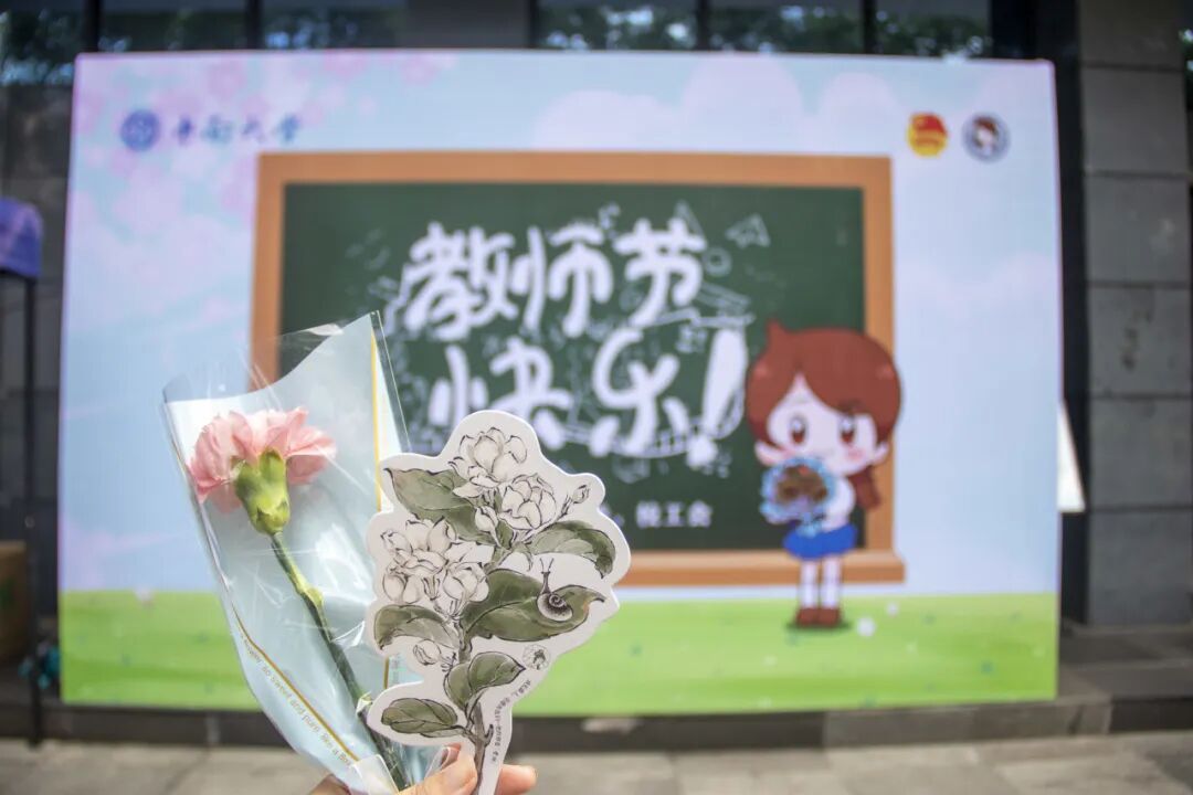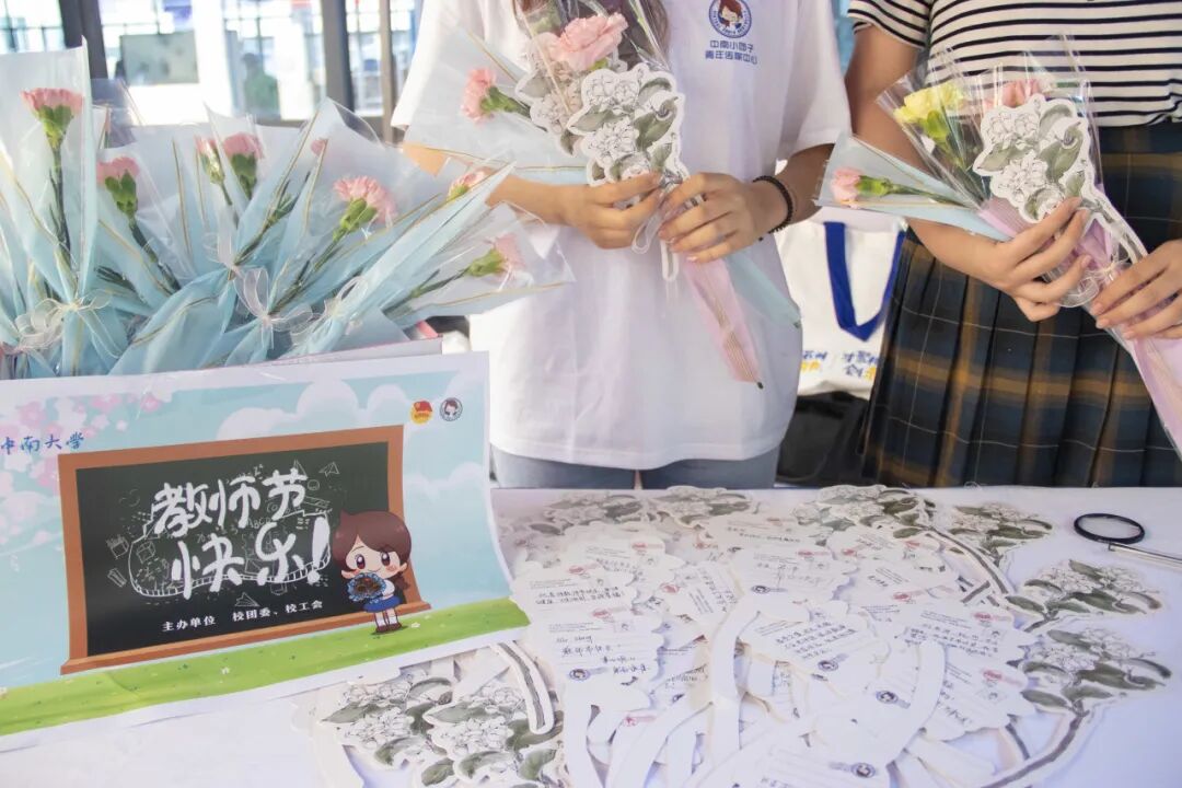 9月8日,学校工会和校团委合作订购了1000朵鲜花,在校本部二食堂、九食堂和南校区升华餐饮楼一楼为各位亲爱的老师们送上祝福和鲜花,并定格老师的最美风采。同学们免费领取明信片,在卡片上写上对老师们的真诚祝福。