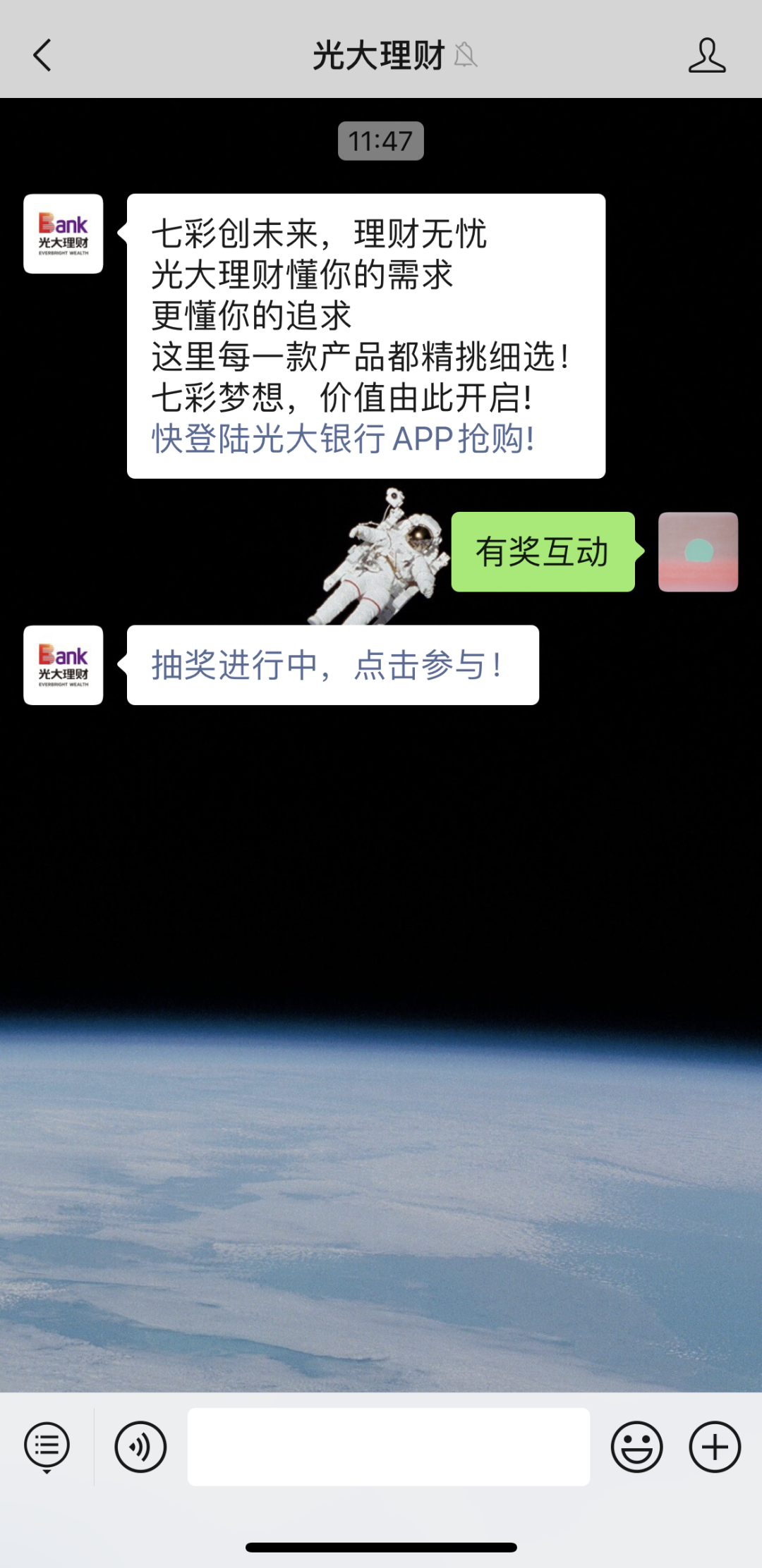 参与【有奖互动】,互动赢取好礼,通过多种活动了解光大理财,更深层次的沟通和了解助力你我携手共创美好未来!