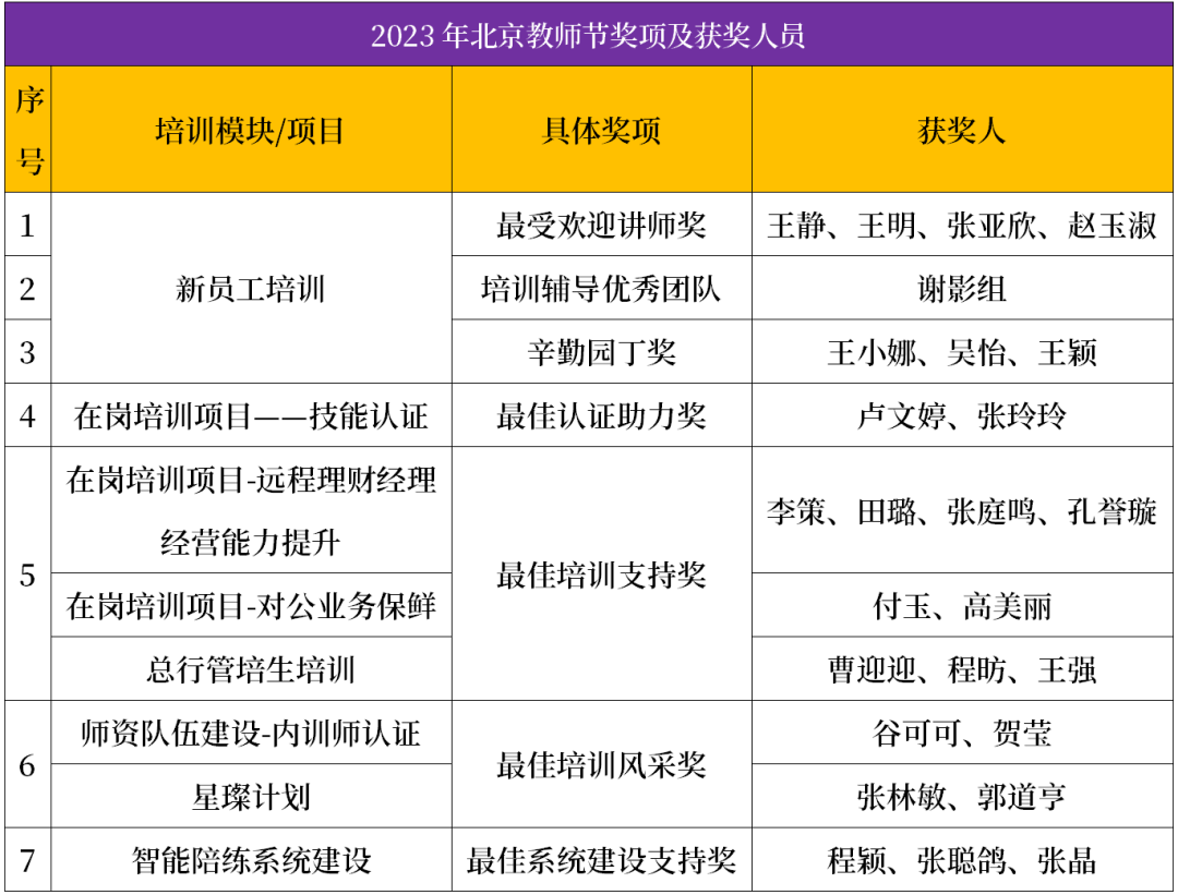 本次活动对在新员工及技能标签认证培训项目中授课评价、场次及效果、培训各项目中(远程理财经理经营能力提升、对公业务保鲜、总行管培生培训)课程自主开发及授课、内训师主题月活动和智能陪练场景搭建等方面,表现突出的个人或团队表示认可和感谢,并对其进行奖项评选,以弘扬优秀榜样力量,赞颂勤学进取思想,致敬师德无私精神。