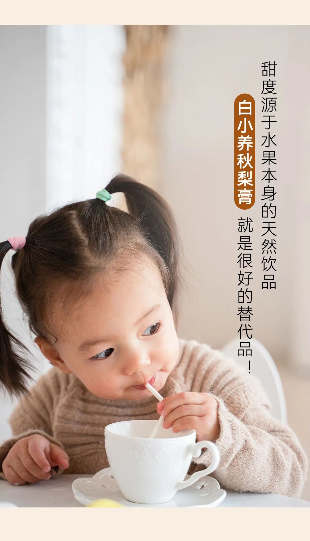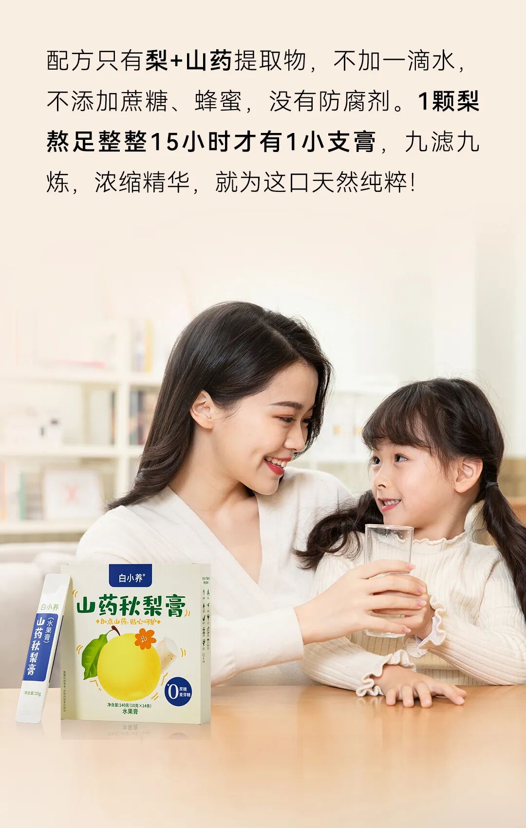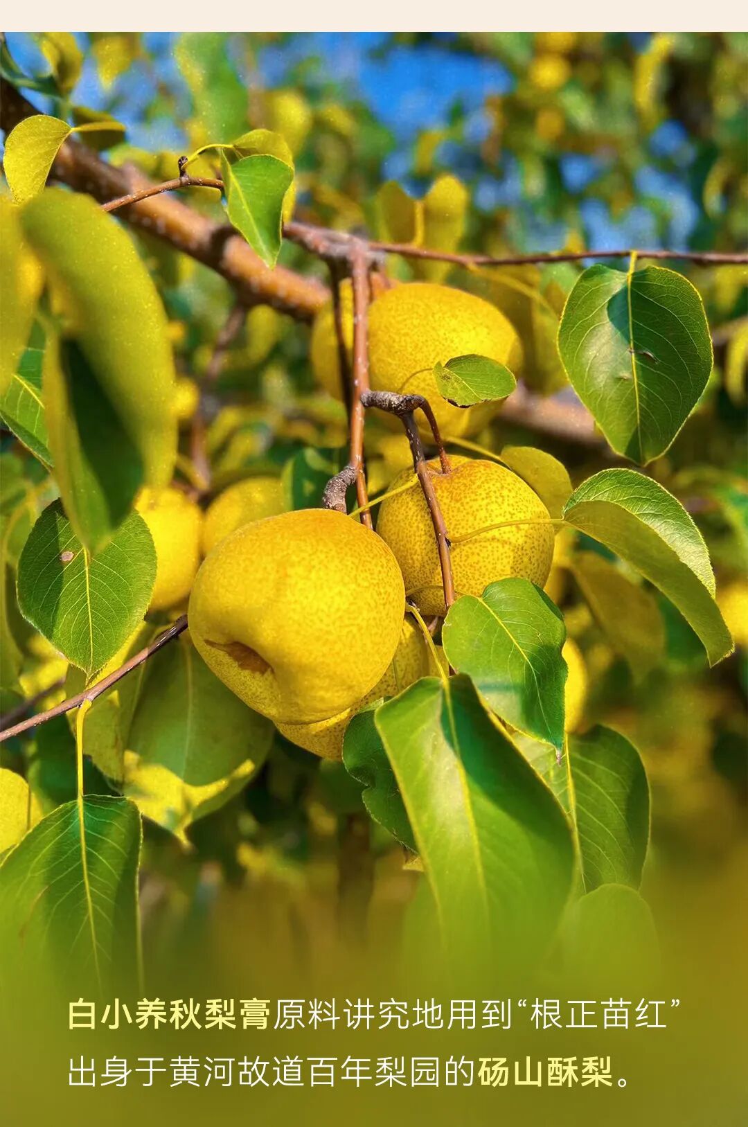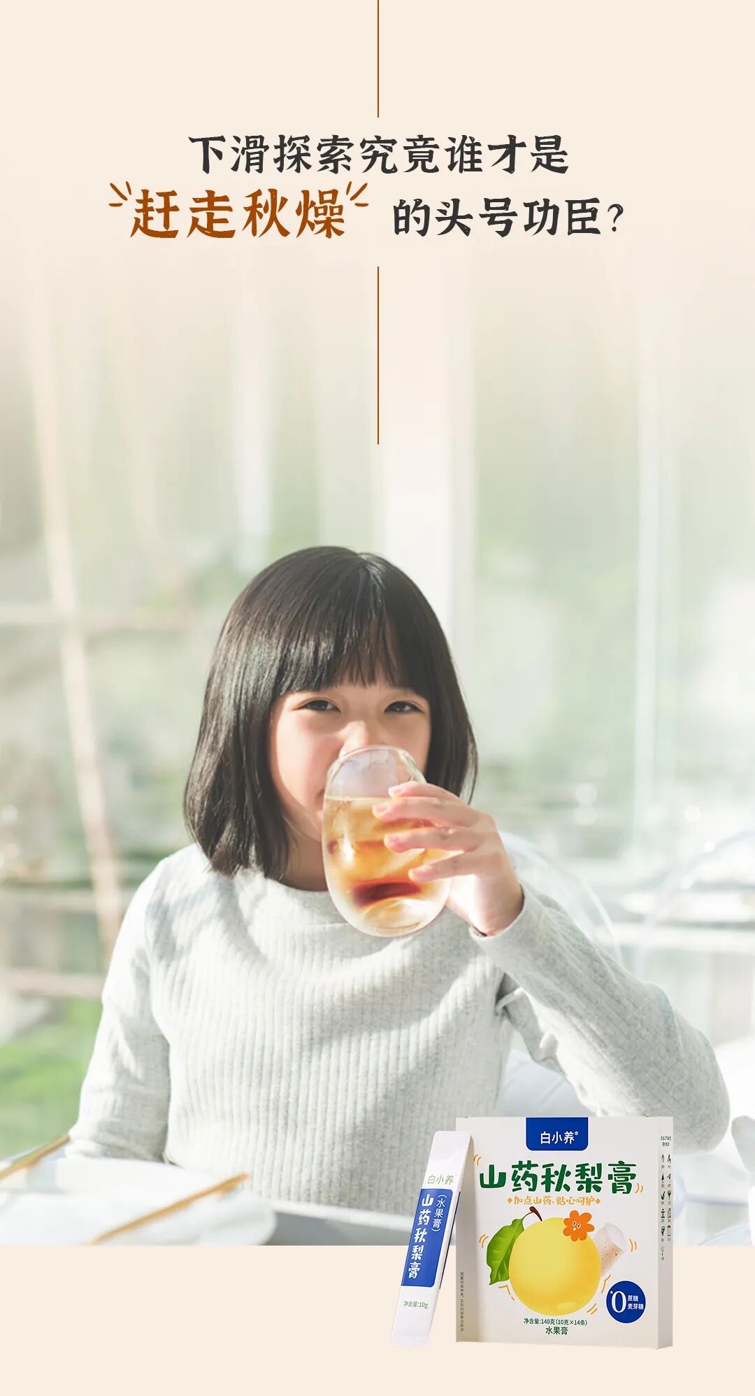 秋风多,雨相和最近,气温明显下降不少,秋天到了,不少人都会出现声音沙哑、皮肤干痒等“秋燥”问题,大人尚且如此,宝宝们怎么会不难受呢?皮肤干燥、鼻干口干、干咳少痰、大便干结点一点,秋燥不见了?新鲜的梨香四溢,和秋燥说拜拜,拥抱天高气爽!赶走秋燥的头号功臣?白小养秋梨膏补水润燥不怕“寒”针对秋燥侵袭,“多喝水”是基础,其次还讲究“滋阴”白小养秋梨膏是很好的选择将润燥生津的砀山梨和健脾养胃的山药融于一方徐徐生津,以养真阴,消内外之燥。【润而不寒 宝宝爱上续杯】好梨膏,原料大有来头,配比严格把关!砀山酥梨 润燥生津一口清润,喉咙滋润舒服砀山梨的清甜,让宝宝爱上喝水白小养秋梨膏原料讲究地用到“根正苗红”出身于黄河故道百年梨园的砀山酥梨。北纬34°的黄河故道,土质松散,矿物质丰富;日照2219h/年在果树上自然成熟;10.3℃的昼夜温差,养出糖分足、果肉厚、多汁脆爽的砀山酥梨!选择砀山酥梨的原因,不仅汁多味美,还因为它具有90%的梨都不含的原儿茶酸,自带化痰止咳、抗菌消炎的属性。山药,健脾养胃梨味甘却性寒,吃多恐伤脾胃山药入肺、脾、肾经,为宝宝脾胃添护力经过国药大师张震传承人韩院长的把关配方与百余次调试,创新采用砀山酥梨与山药配伍。医家评价山药为“温补”“性平”,是“药食同源”的典范。白小养秋梨膏中的山药多糖提取物,其原料只采用河南焦作垆土铁棍山药。“铁棍山药”为怀山药中的珍品,富含多糖、微量元素、游离氨基酸等营养物质,现代医学表明山药及其提取物具保护消化道的作用。白小养秋梨膏在砀山梨的基础上多一味铁棍山药,确保祛燥热的同时健脾养胃不怕寒。【扎实用料 一杯一颗鲜梨】