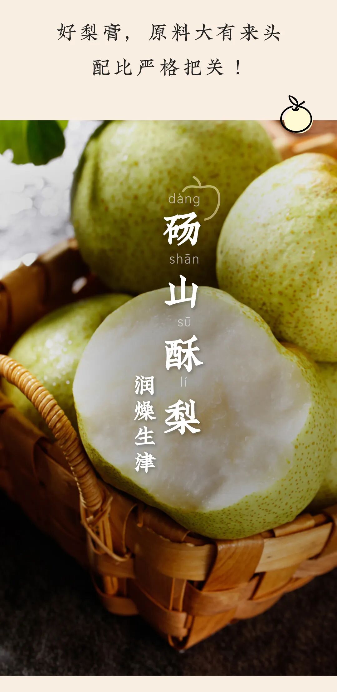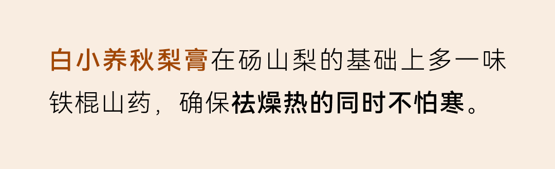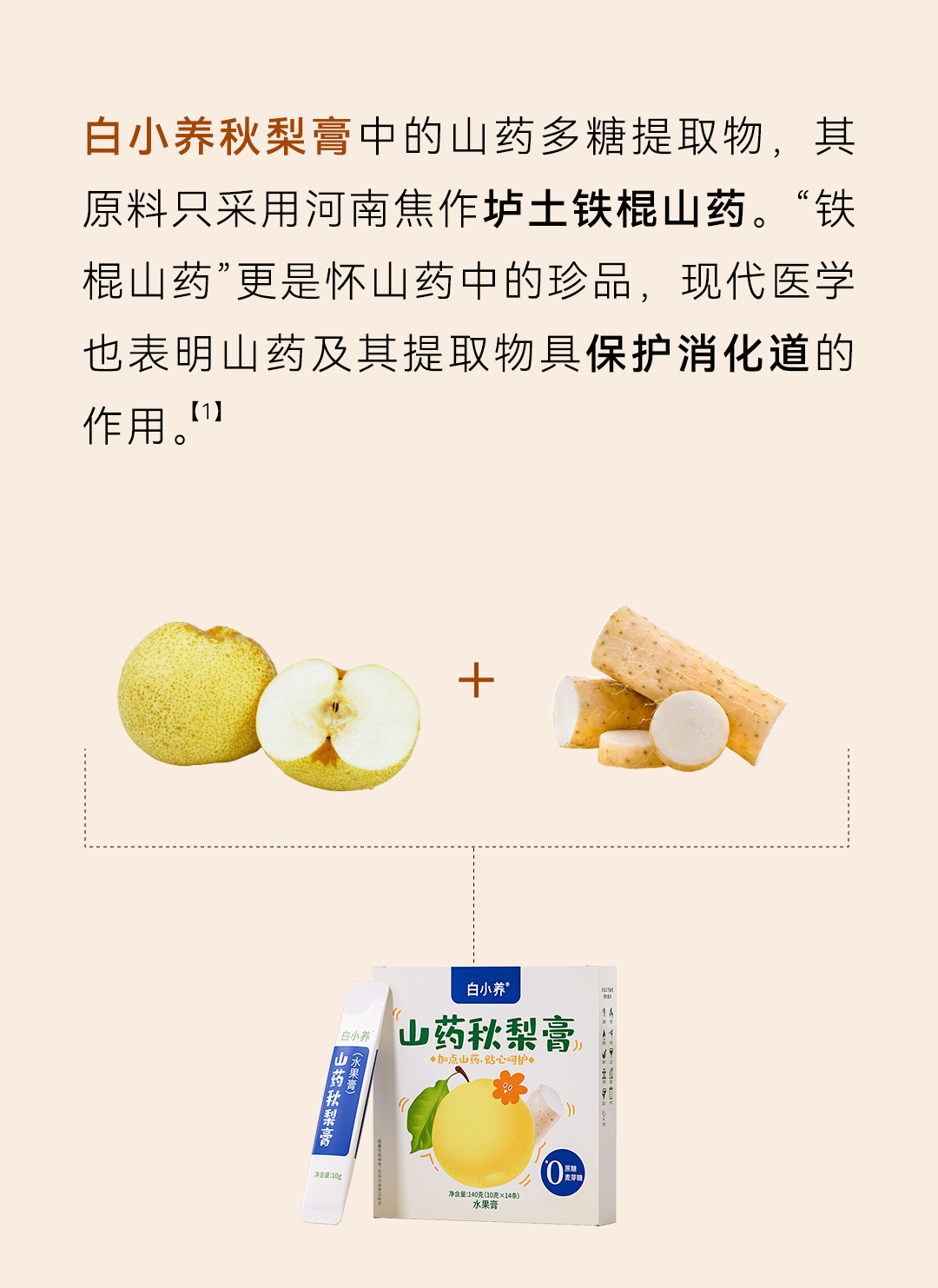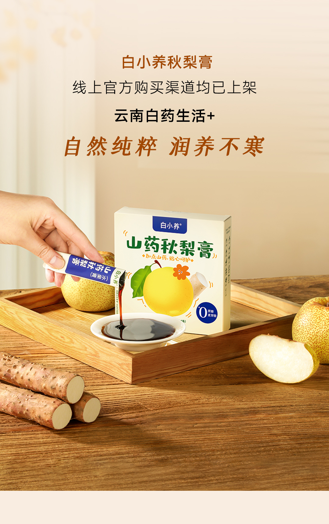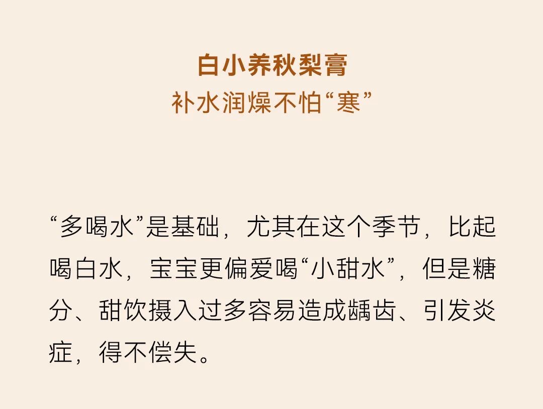 秋风多,雨相和最近,气温明显下降不少,秋天到了,不少人都会出现声音沙哑、皮肤干痒等“秋燥”问题,大人尚且如此,宝宝们怎么会不难受呢?皮肤干燥、鼻干口干、干咳少痰、大便干结点一点,秋燥不见了?新鲜的梨香四溢,和秋燥说拜拜,拥抱天高气爽!赶走秋燥的头号功臣?白小养秋梨膏补水润燥不怕“寒”针对秋燥侵袭,“多喝水”是基础,其次还讲究“滋阴”白小养秋梨膏是很好的选择将润燥生津的砀山梨和健脾养胃的山药融于一方徐徐生津,以养真阴,消内外之燥。【润而不寒 宝宝爱上续杯】好梨膏,原料大有来头,配比严格把关!砀山酥梨 润燥生津一口清润,喉咙滋润舒服砀山梨的清甜,让宝宝爱上喝水白小养秋梨膏原料讲究地用到“根正苗红”出身于黄河故道百年梨园的砀山酥梨。北纬34°的黄河故道,土质松散,矿物质丰富;日照2219h/年在果树上自然成熟;10.3℃的昼夜温差,养出糖分足、果肉厚、多汁脆爽的砀山酥梨!选择砀山酥梨的原因,不仅汁多味美,还因为它具有90%的梨都不含的原儿茶酸,自带化痰止咳、抗菌消炎的属性。山药,健脾养胃梨味甘却性寒,吃多恐伤脾胃山药入肺、脾、肾经,为宝宝脾胃添护力经过国药大师张震传承人韩院长的把关配方与百余次调试,创新采用砀山酥梨与山药配伍。医家评价山药为“温补”“性平”,是“药食同源”的典范。白小养秋梨膏中的山药多糖提取物,其原料只采用河南焦作垆土铁棍山药。“铁棍山药”为怀山药中的珍品,富含多糖、微量元素、游离氨基酸等营养物质,现代医学表明山药及其提取物具保护消化道的作用。白小养秋梨膏在砀山梨的基础上多一味铁棍山药,确保祛燥热的同时健脾养胃不怕寒。【扎实用料 一杯一颗鲜梨】
