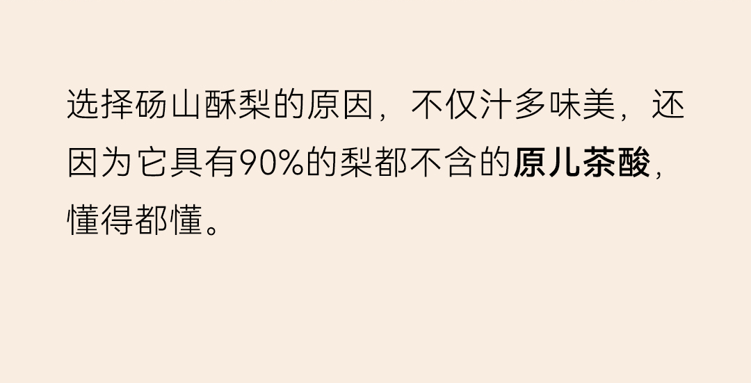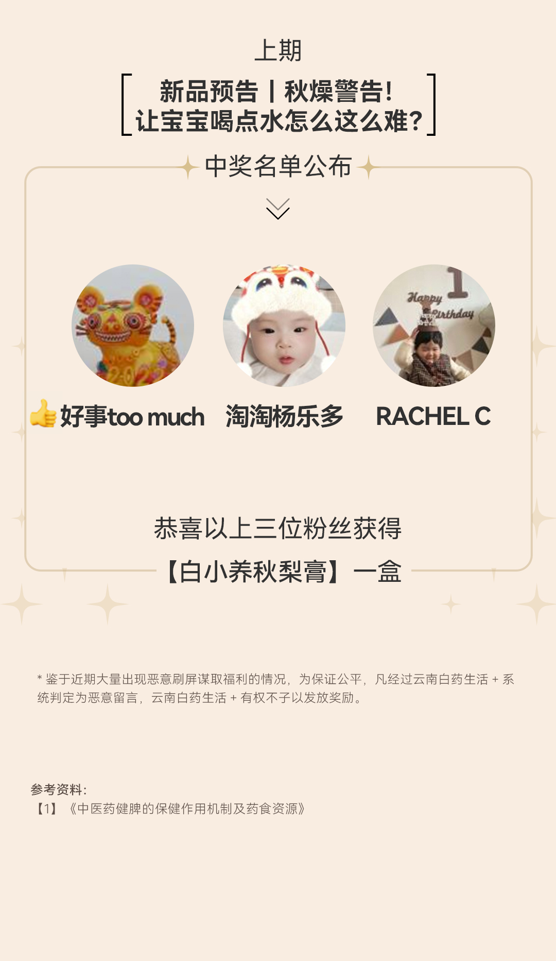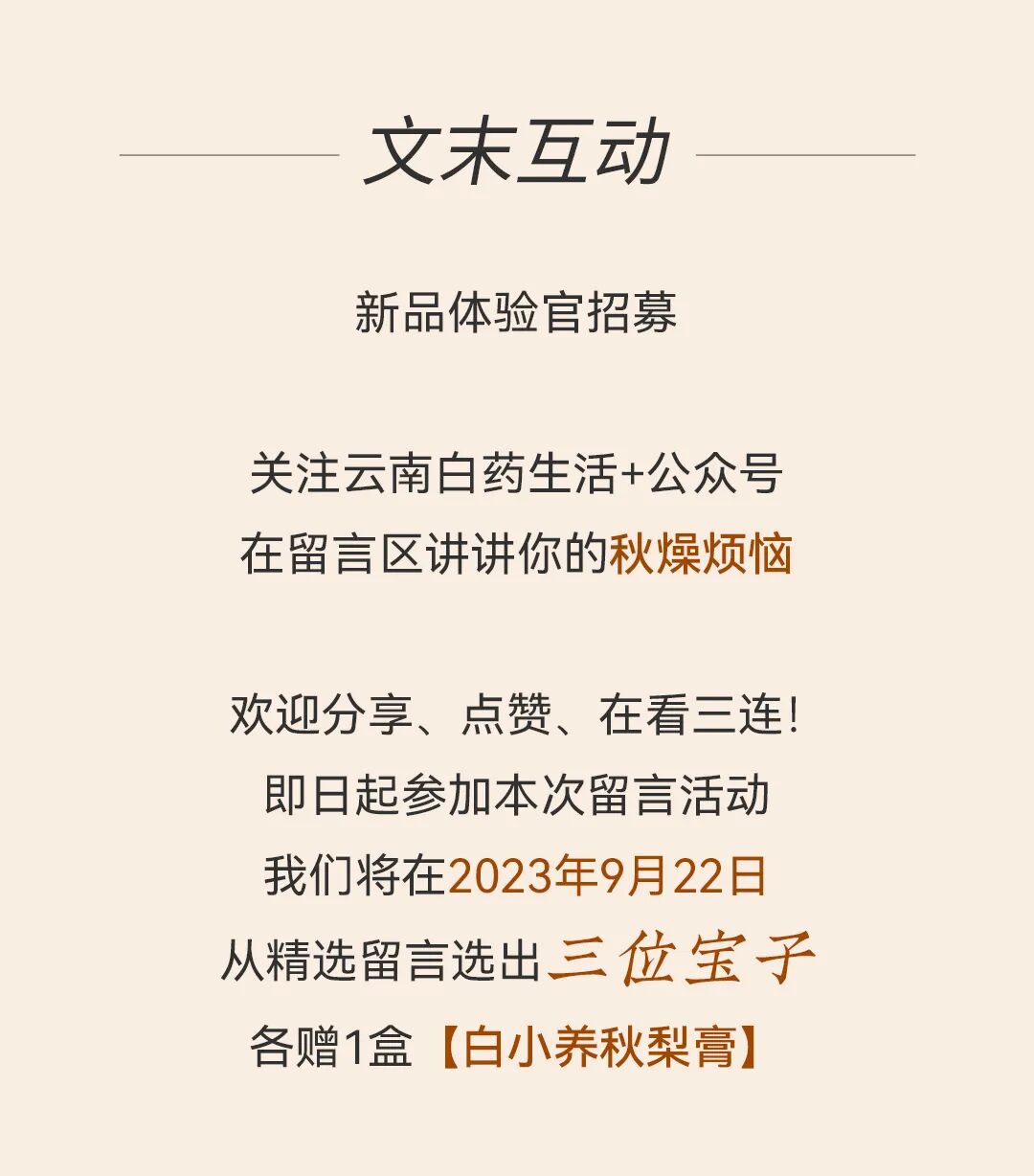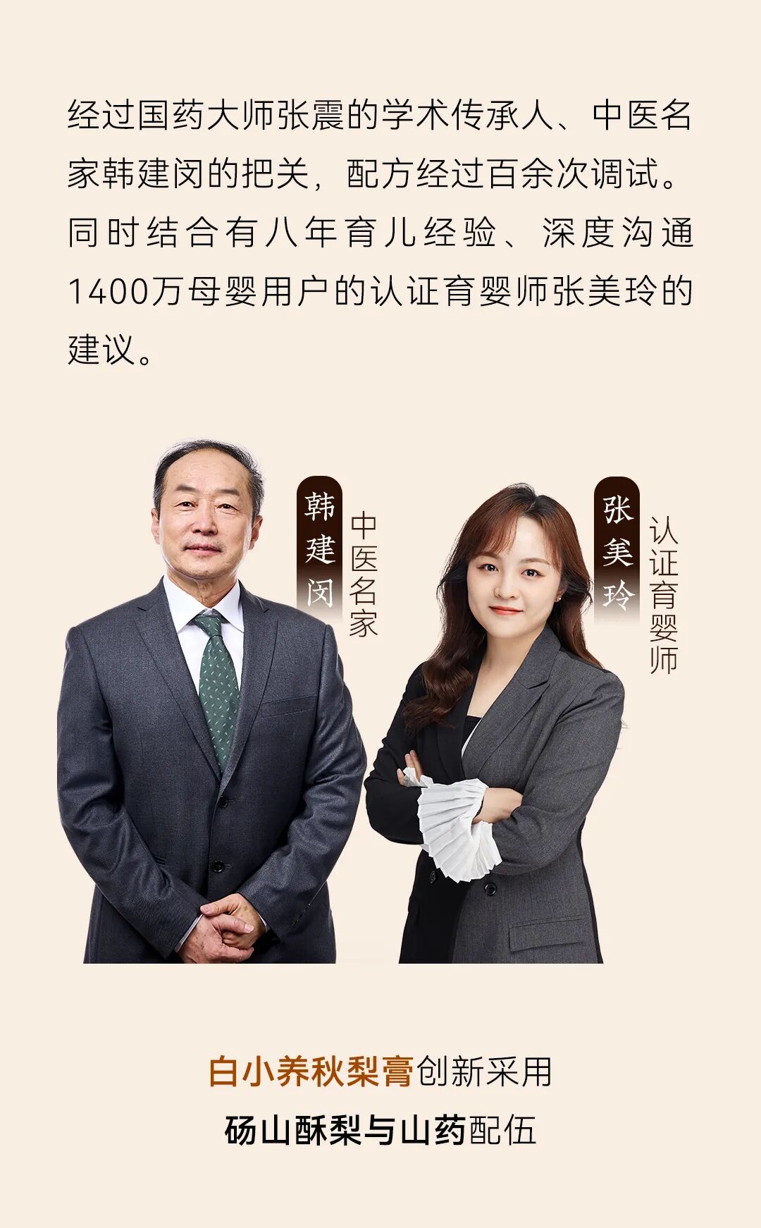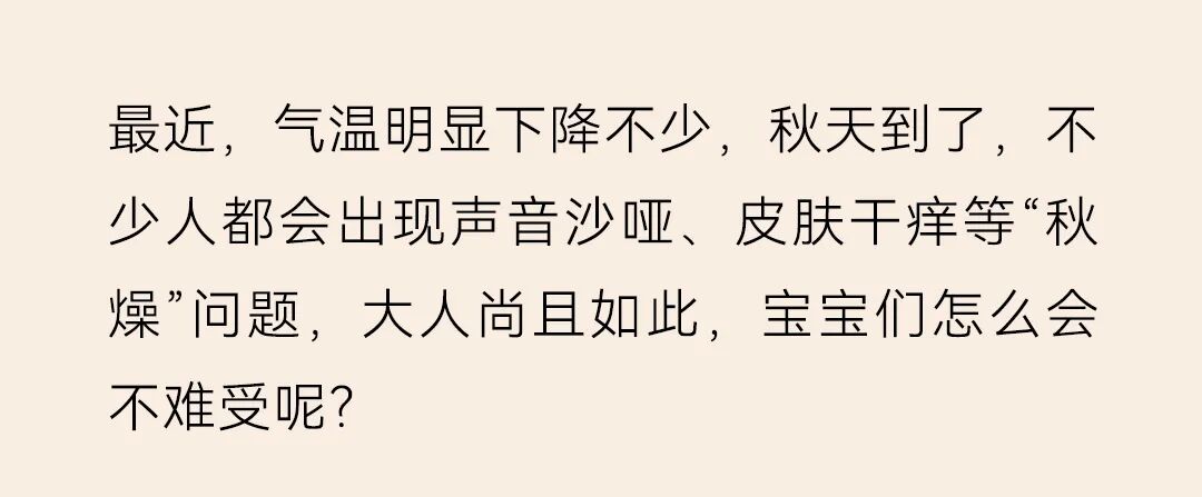 秋风多,雨相和最近,气温明显下降不少,秋天到了,不少人都会出现声音沙哑、皮肤干痒等“秋燥”问题,大人尚且如此,宝宝们怎么会不难受呢?皮肤干燥、鼻干口干、干咳少痰、大便干结点一点,秋燥不见了?新鲜的梨香四溢,和秋燥说拜拜,拥抱天高气爽!赶走秋燥的头号功臣?白小养秋梨膏补水润燥不怕“寒”针对秋燥侵袭,“多喝水”是基础,其次还讲究“滋阴”白小养秋梨膏是很好的选择将润燥生津的砀山梨和健脾养胃的山药融于一方徐徐生津,以养真阴,消内外之燥。【润而不寒 宝宝爱上续杯】好梨膏,原料大有来头,配比严格把关!砀山酥梨 润燥生津一口清润,喉咙滋润舒服砀山梨的清甜,让宝宝爱上喝水白小养秋梨膏原料讲究地用到“根正苗红”出身于黄河故道百年梨园的砀山酥梨。北纬34°的黄河故道,土质松散,矿物质丰富;日照2219h/年在果树上自然成熟;10.3℃的昼夜温差,养出糖分足、果肉厚、多汁脆爽的砀山酥梨!选择砀山酥梨的原因,不仅汁多味美,还因为它具有90%的梨都不含的原儿茶酸,自带化痰止咳、抗菌消炎的属性。山药,健脾养胃梨味甘却性寒,吃多恐伤脾胃山药入肺、脾、肾经,为宝宝脾胃添护力经过国药大师张震传承人韩院长的把关配方与百余次调试,创新采用砀山酥梨与山药配伍。医家评价山药为“温补”“性平”,是“药食同源”的典范。白小养秋梨膏中的山药多糖提取物,其原料只采用河南焦作垆土铁棍山药。“铁棍山药”为怀山药中的珍品,富含多糖、微量元素、游离氨基酸等营养物质,现代医学表明山药及其提取物具保护消化道的作用。白小养秋梨膏在砀山梨的基础上多一味铁棍山药,确保祛燥热的同时健脾养胃不怕寒。【扎实用料 一杯一颗鲜梨】