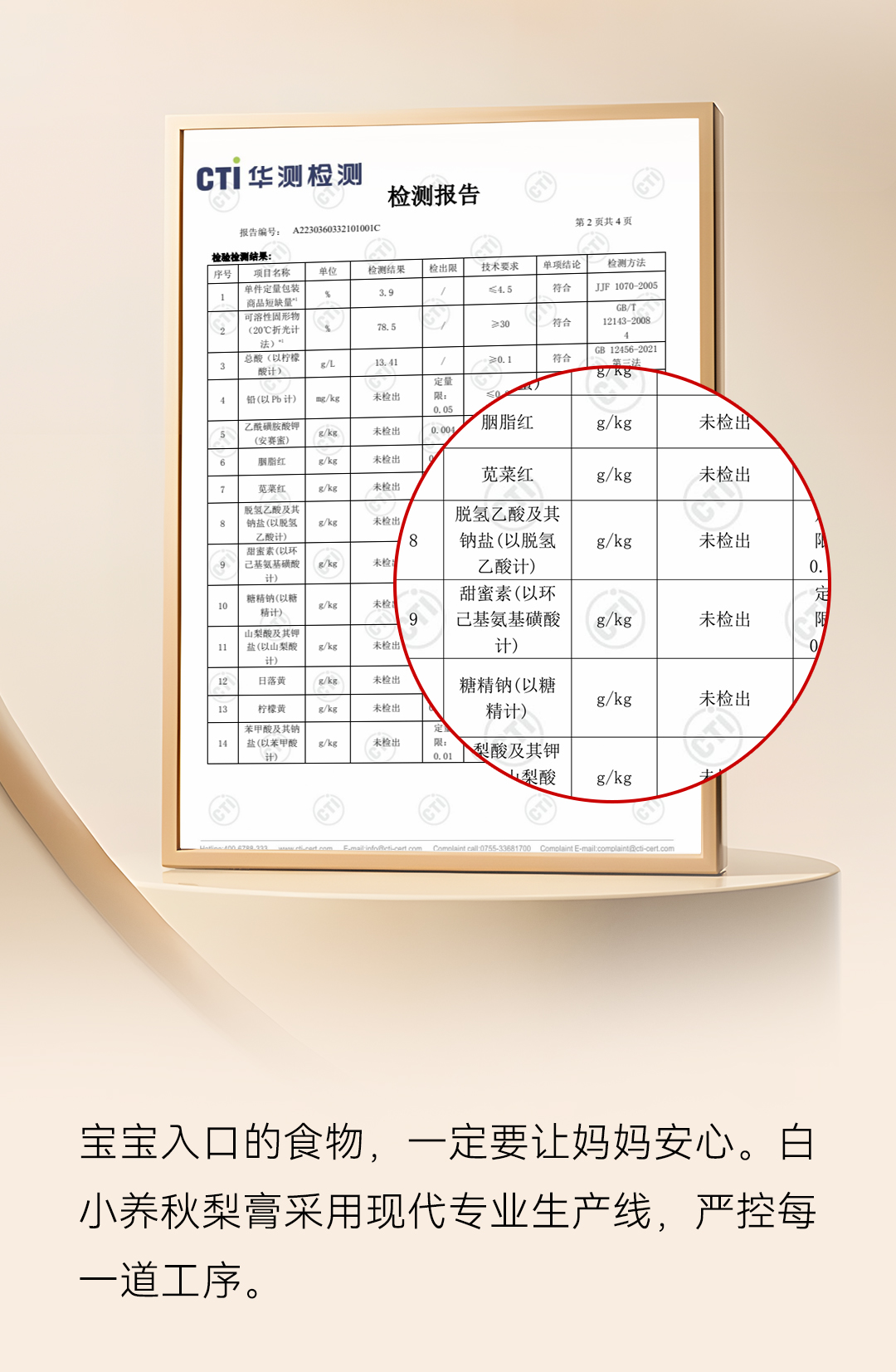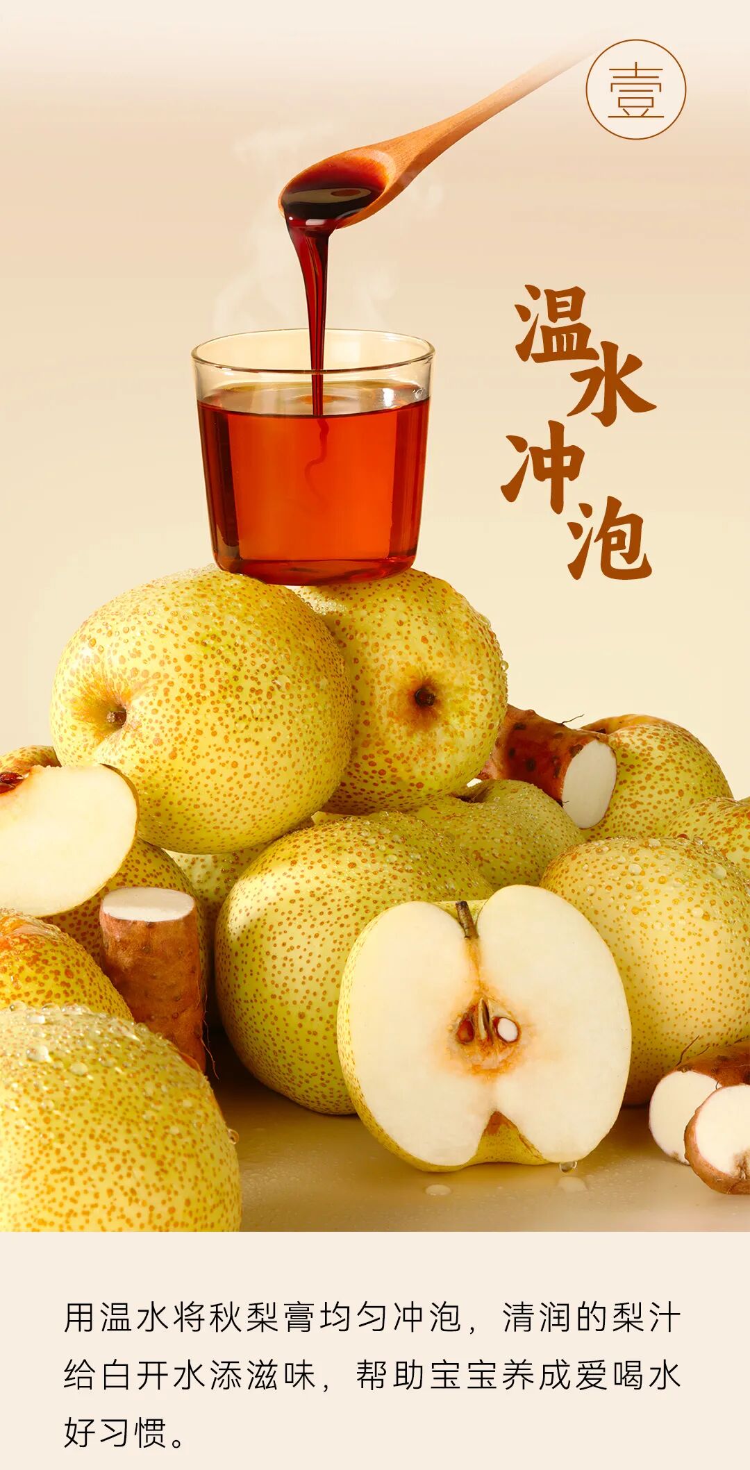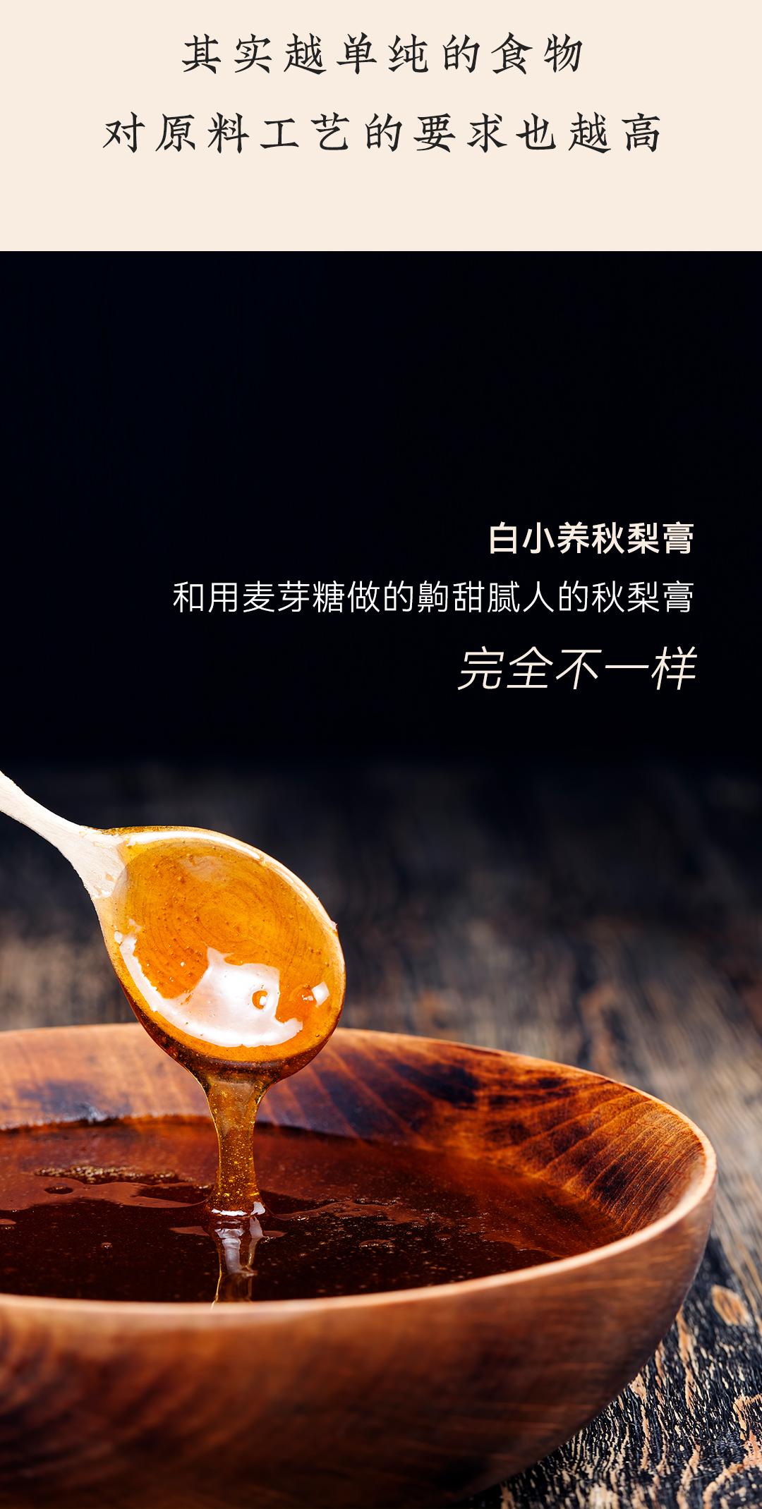 其实越单纯的食物,对原料工艺的要求也越高。市面上有的秋梨膏会通过“加水作弊”加速熬制时间,更有甚者添加糖作为防腐、增稠剂并遮盖异味。白小养秋梨膏和用麦芽糖做的齁甜腻人的秋梨膏完全不一样。配方只有梨+山药提取物,不加一滴水,不添加蔗糖、蜂蜜,没有防腐剂。25斤梨熬足整整15小时才有1斤膏,九滤九炼,浓缩精华,就为这口天然纯粹!宝宝入口的食物,一定要让妈妈安心。白小养秋梨膏已经通过瑞士SGS检测,234项农残检测,现代专业生产线,严控每一道工序。【花样吃法 开启秋冬润养】1.秋梨膏泡水喝