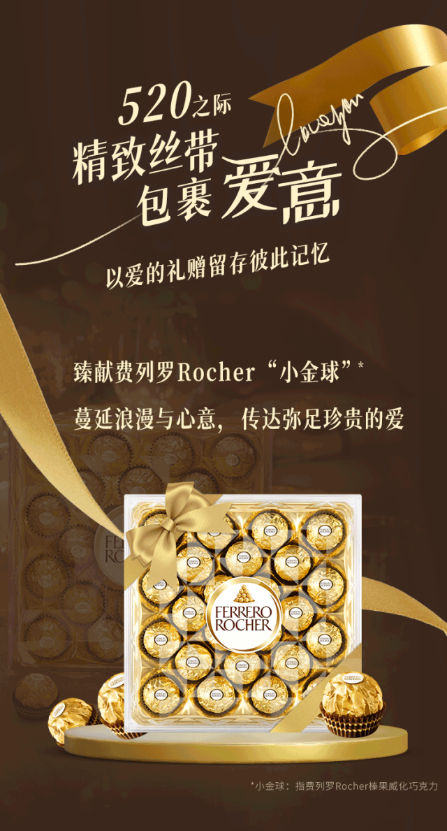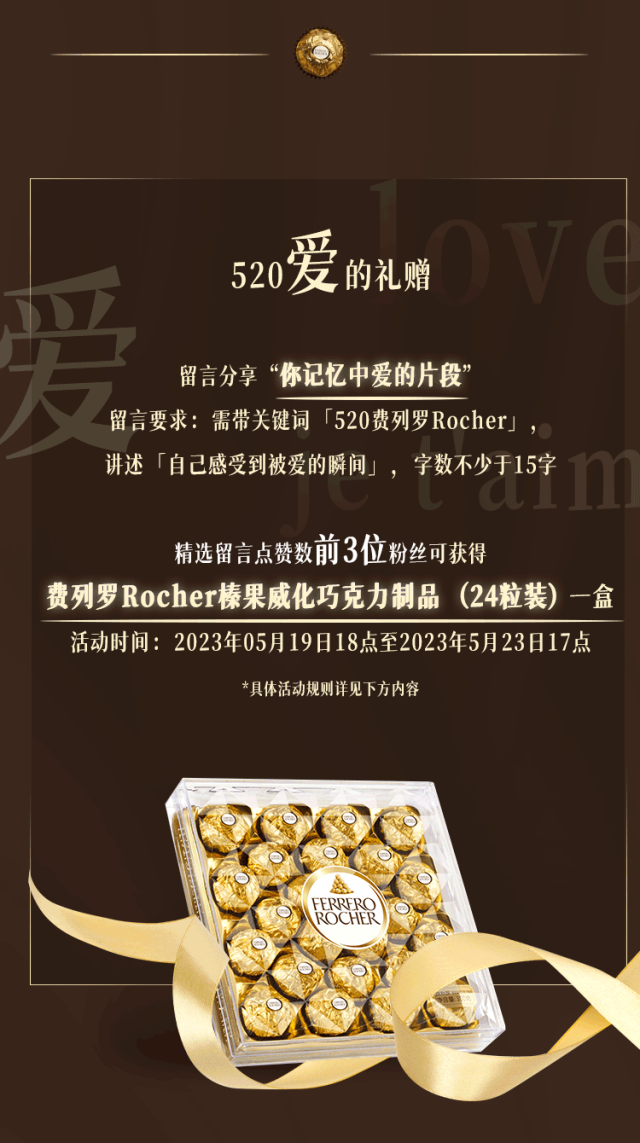 1.活动期间,用户在本推文下方留言分享“你记忆中爱的片段”(留言要求:需带关键词「520费列罗Rocher」,讲述「自己感受到被爱的瞬间」,字数不少于15字)并被纳入精选留言的(费列罗Rocher官方微信后台将按留言时间顺序精选满足要求的前【30】条留言,留言时间相同的将同时纳入精选留言),即视为成功参与活动。