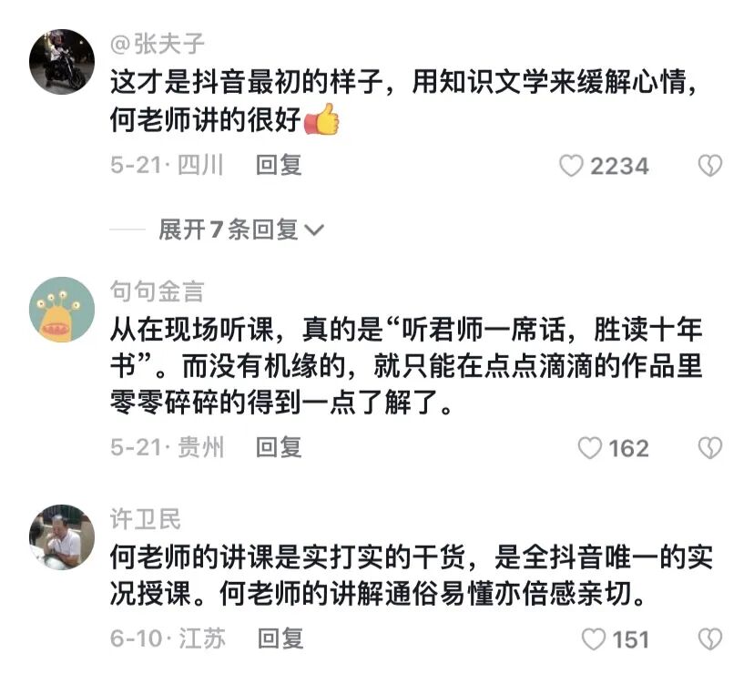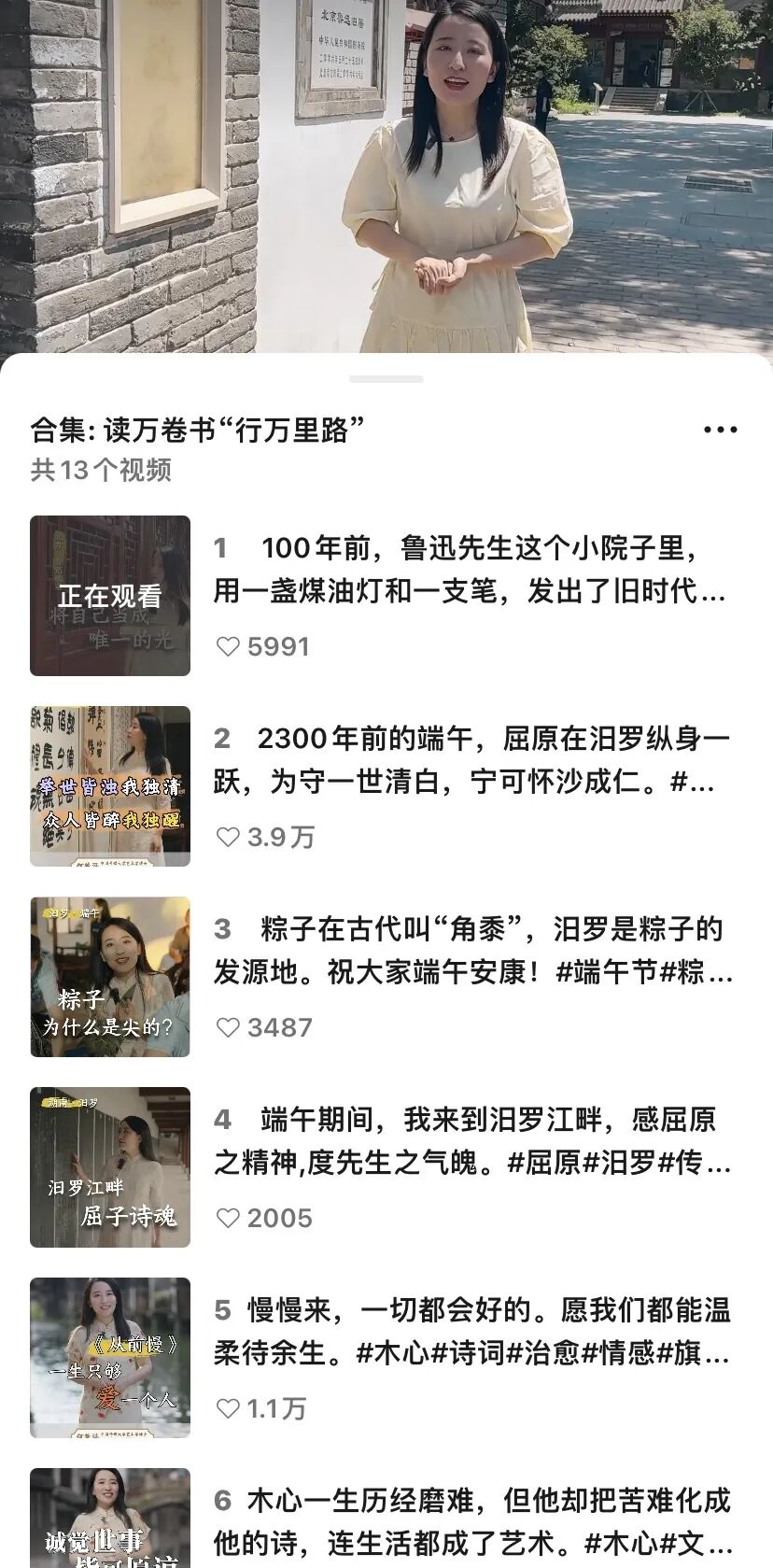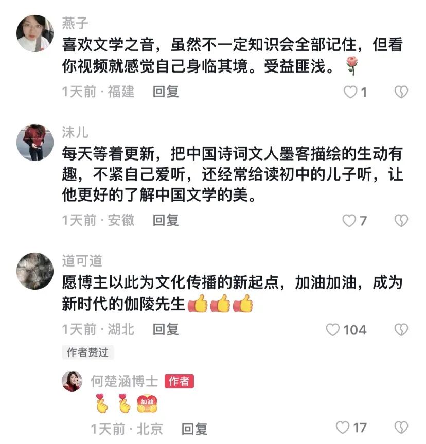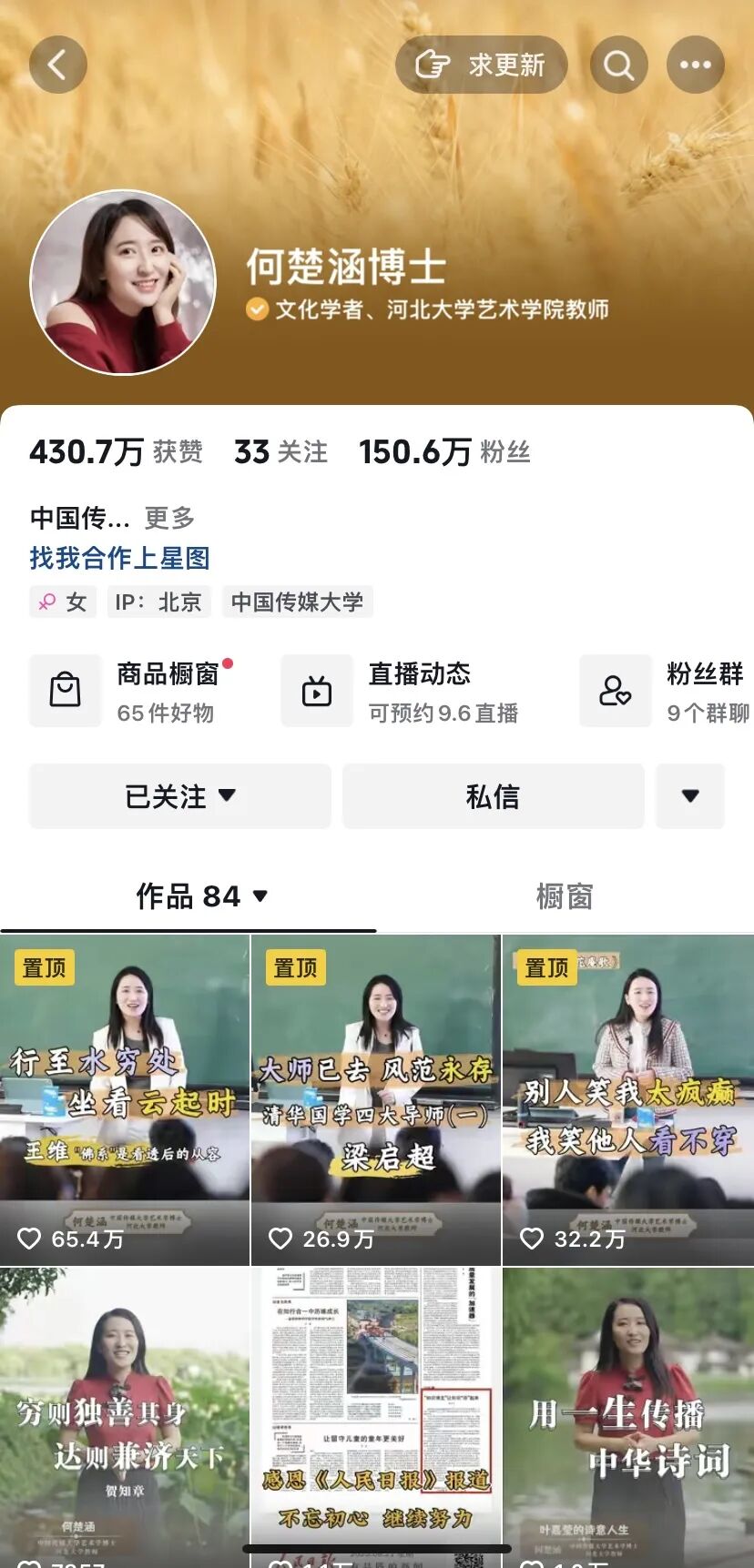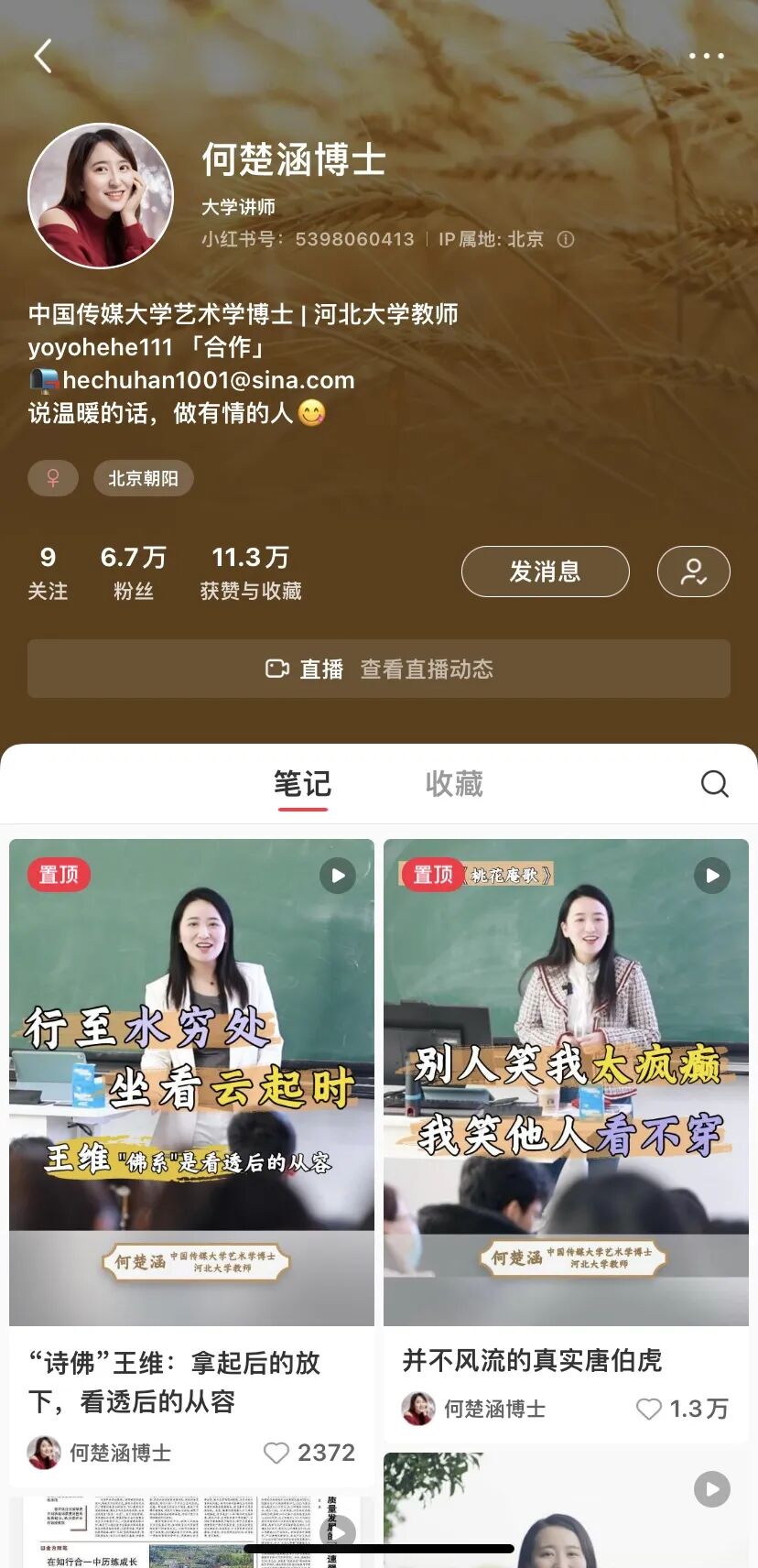 以上出自何楚涵老师的视频号,近期何楚涵老师凭借着自身丰富的学识和轻松的讲课风格“出圈”,被评价为“最会讲故事的女博士”。在讲课之余,她选择在互联网上,以“知识博主”的身份传播文化,据悉,每天有100多万人在抖音跟她上“大学”。