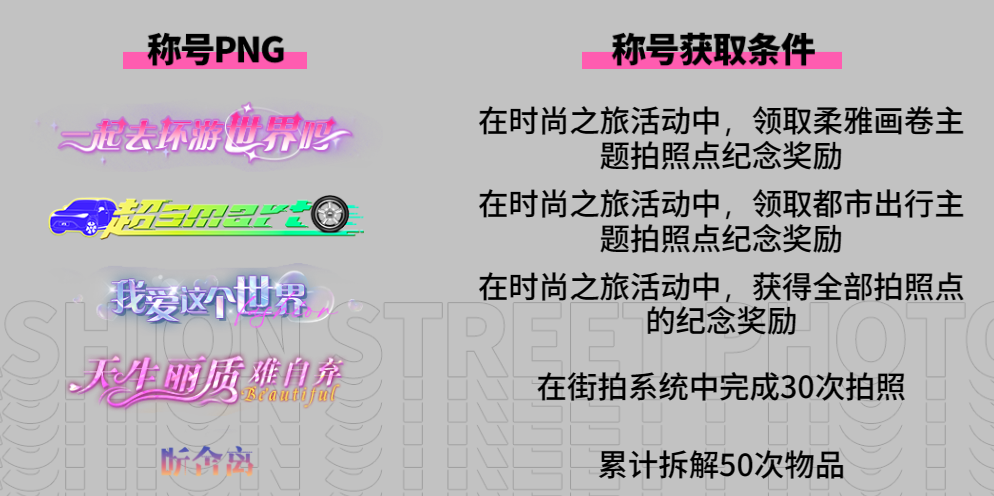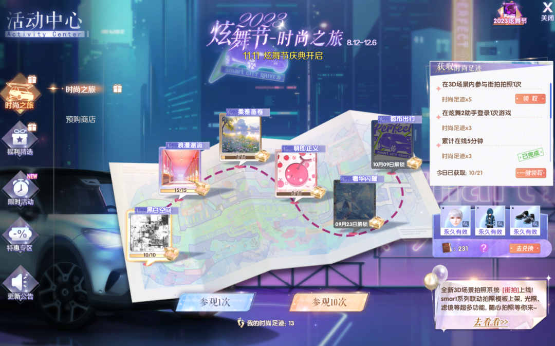 完成指定任务获得时尚足迹,使用时尚足迹可参观拍照点,每次参观均可获得时尚笔记、炫舞币道具。每个拍照点累计参观足够次数还可额外获得时尚笔记、炫舞币及徽记、称号、头像框奖励。每个拍照点解锁后均可获得对应街拍模板,首次完成街拍模板拍摄可获得时尚笔记道具。