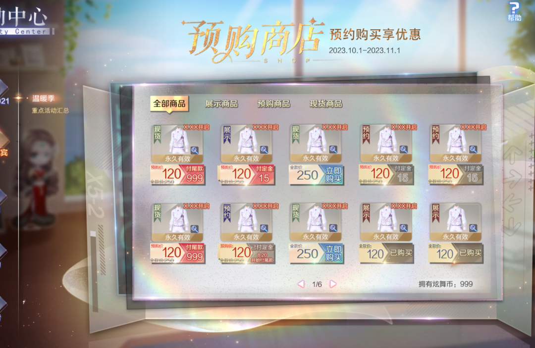 预约购买享优惠,炫舞节预购商店活动重磅回归!使用炫舞币即可在预购商店中购买超多惊喜好礼!在预购阶段支付定金并在现货阶段付清尾款最划算哦!错过预购也不用担心,在活动结束前,进入现货阶段的商品均可无折扣原价购买~