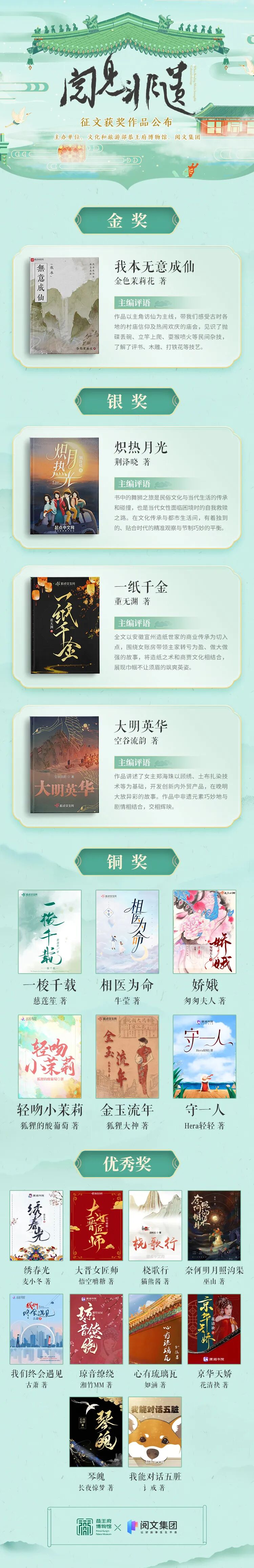其中,《我本无意成仙》获金奖,《炽热月光》《一纸千金》《大明英华》获银奖,《一梭千载》《相医为命》《娇娥》《轻吻小茉莉》《金玉流年》《守一人》获铜奖。