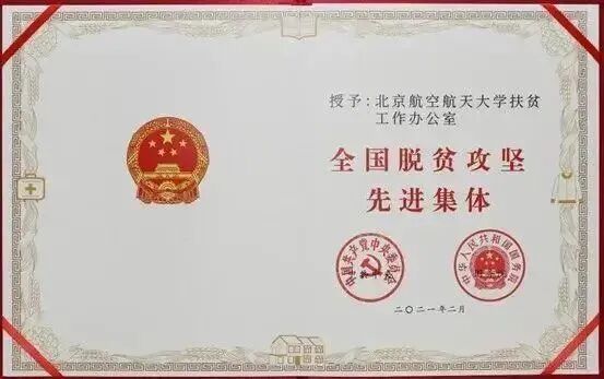 2021年,北京航空航天大学扶贫工作办公室获得全国脱贫攻坚先进集体