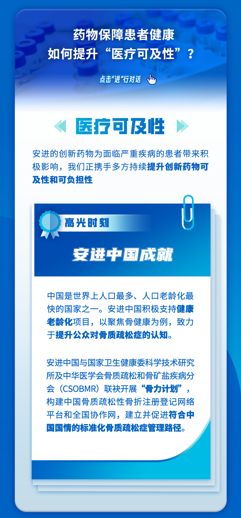 自2012年进入中国以来,安进始终以服务患者为使命,立足科学与生物技术,致力于造福中国患者并改善公共健康水平。安进中国总部设于上海,业务覆盖全国100多个城市。在中国,安进聚焦心血管疾病、骨健康、炎症、肿瘤等亟待满足的核心疾病领域的业务,为患者提供创新和更优的治疗选择。
