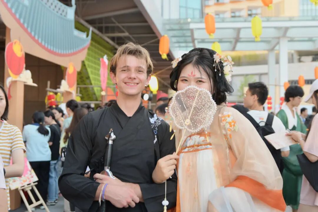 晚会开始前的外场游园会也是精彩纷呈,开市迎客的14个游园摊位,8个节目表演以及4场限时活动不仅融入了非遗、文物等传统元素,还引入了糖画、大唐“不倒翁”等街头艺术表演。手持“通关文牒”与现场60多位NPC互动的创新设计更是让师生们真正沉浸在中华传统节日的浪漫氛围当中。游园会亦有外场主持人现场直播和采访。