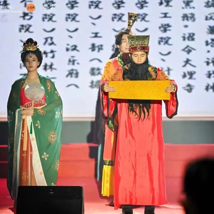 随着灯光渐渐暗下来,一段方言开场白“在演出期间,允许拍照摄像,允许捧腹大笑,请不要面无表情,请不要正襟危坐,中不中?”令现场观众一秒入戏。晚会也正式开始。紧接着数十位NPC纷纷上场,从上官婉儿、太平公主,陆游、辛弃疾,到林黛玉、薛宝钗、到芭比、财神爷...古今中外名人与神话人物纷纷聚集。随着NPC的一段趣味古文开场,观众也跟随穿越大唐盛世。