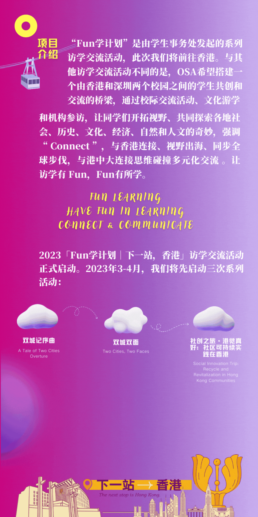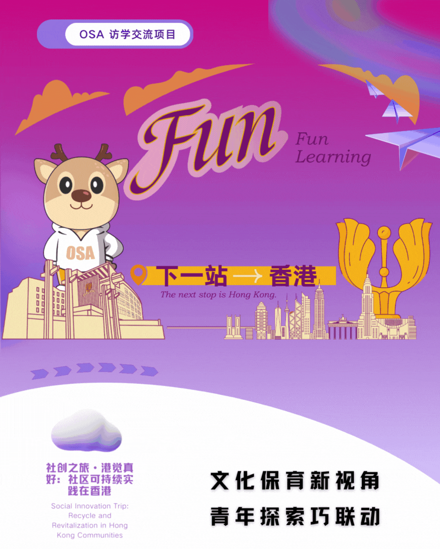 在社会创新领域,香港早已具备多样化的尝试与成效显著的实践,特别是在社区营造和可持续发展方面相对成熟。在本次“Fun学计划|下一站香港”项目中,我们前往美荷楼深度游览深水埗社区,跟随导赏员的脚步在蓝屋建筑群了解文化活化,实地走访街区,对文化保育的实践成果有了更真切的感受。在维多利亚公园,我们登上长春社的非遗专车,「移动.非遗」妙趣横生地向公众传播香港非遗文化知识。通过这次活动,我们一起学习了香港文化保育、可持续发展的具体实践方法。
