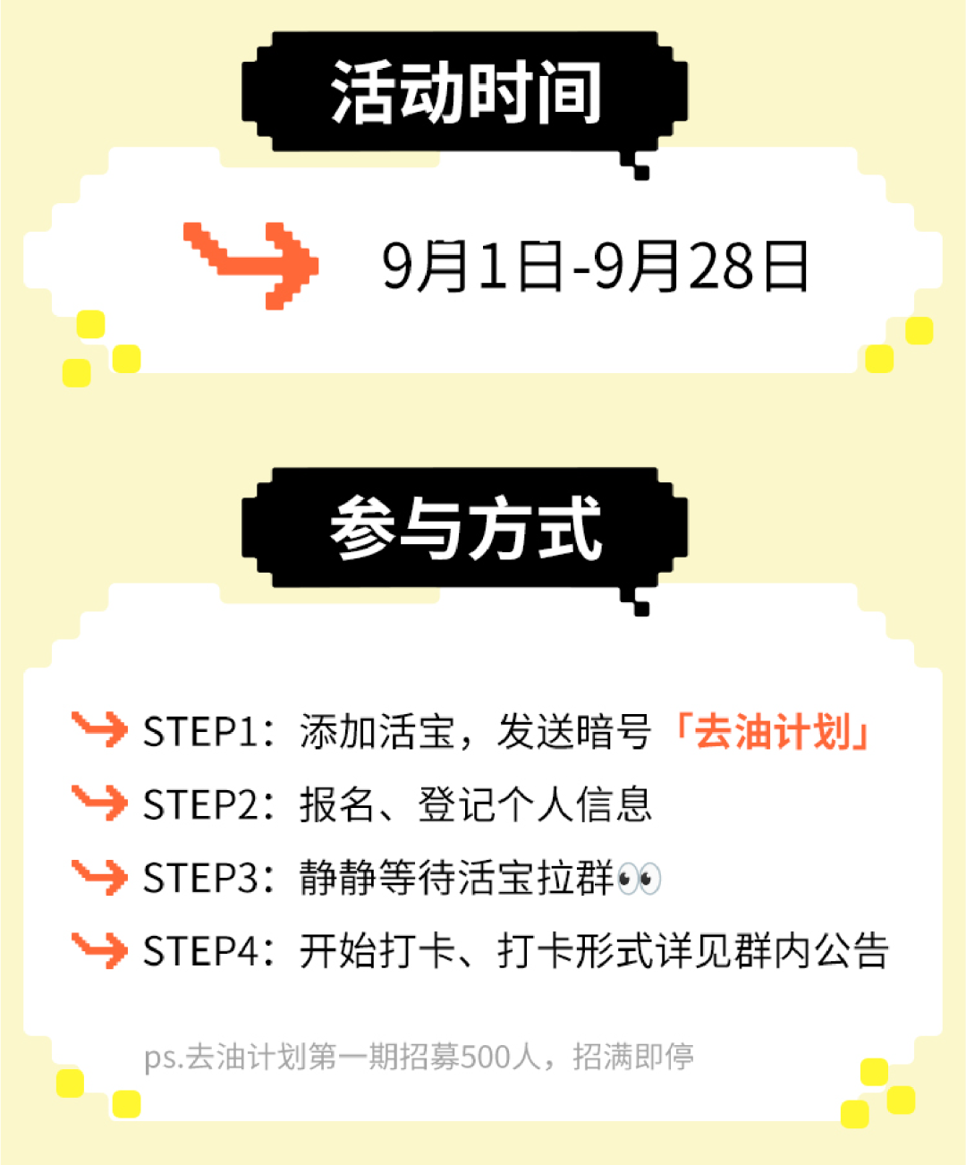 肌活28天去油计划第一期将招募500个小伙伴,招满即止!
