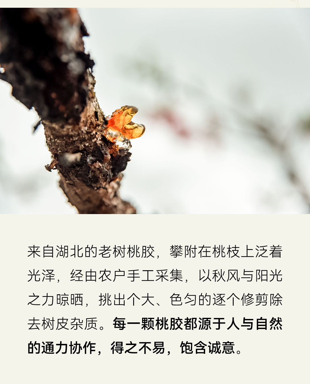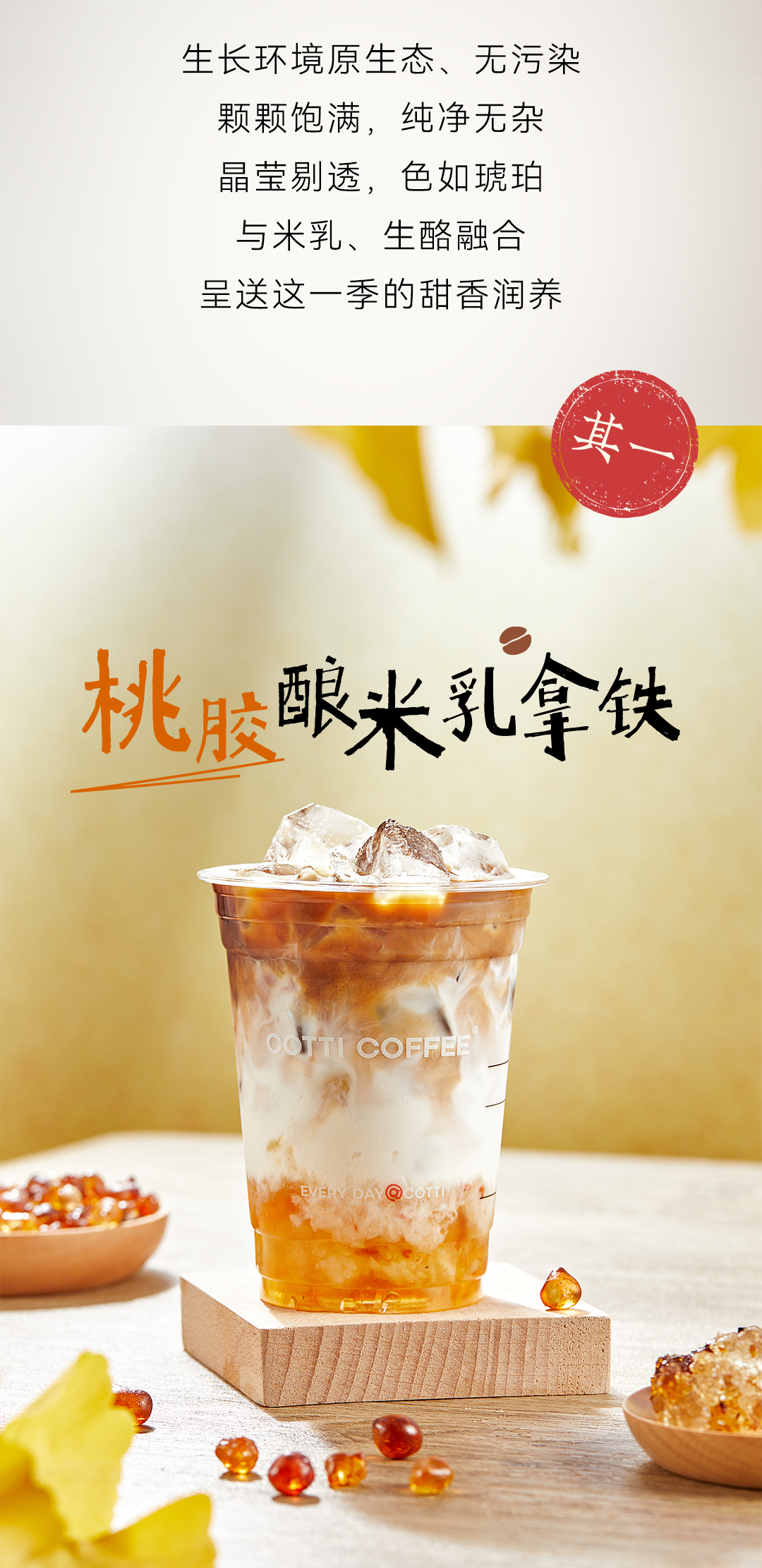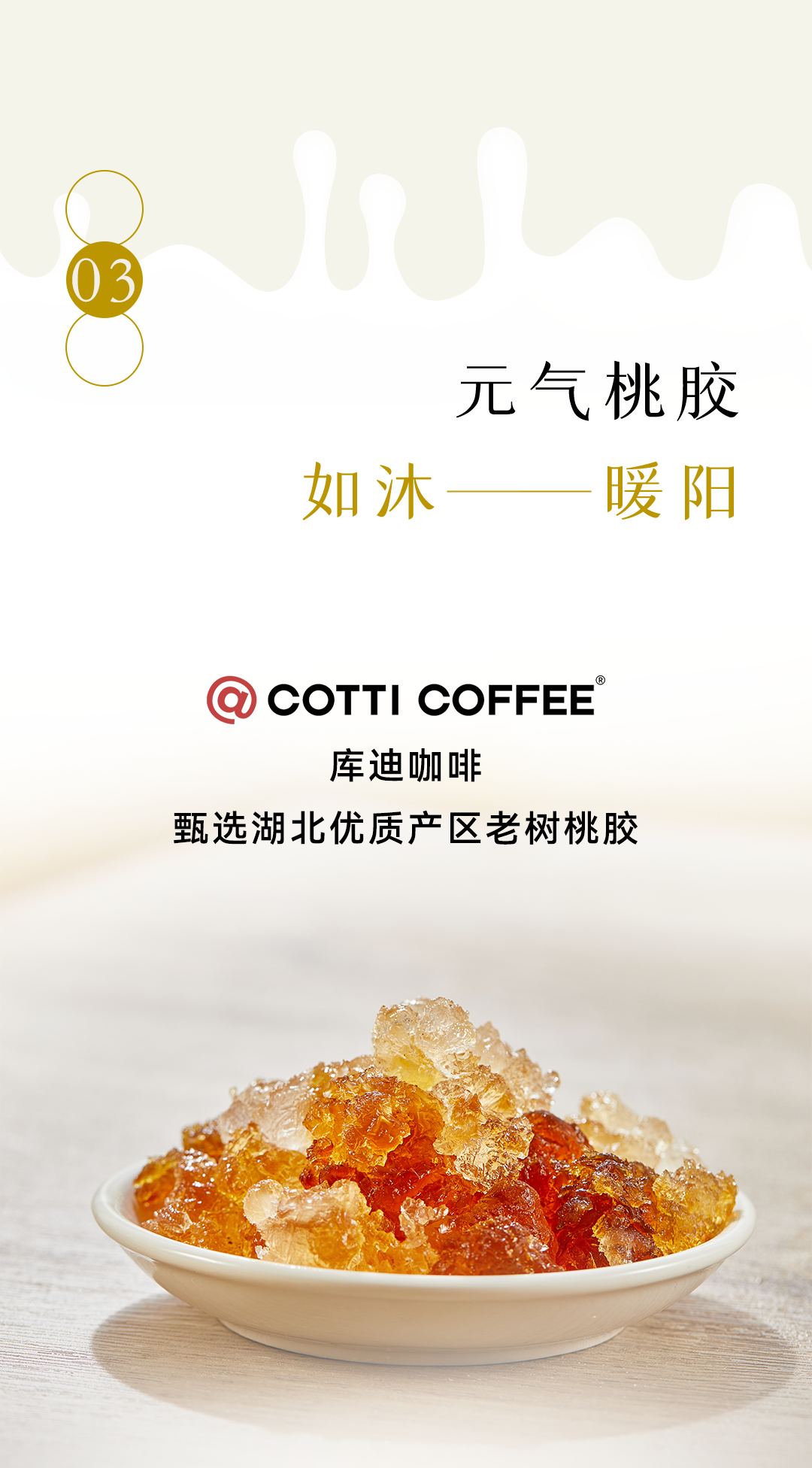 霜天冷,风细细,触疏窗、闪闪灯摇曳。点击「桃」离凉燥01 抵御寒风温暖甜润霜气横秋,寒风凛凛「养生之魂」霎时觉醒!用一碗桃胶炖奶暖暖身晶莹琥珀的桃胶安静沉在碗底汤匙掀起牛奶甜香的波澜弹糯软滑,气微清香是秋冬季节最不想错过的暖心治愈02 桃胶润养 生津润肠这一颗颗晶莹「桃花泪」究竟源自何处?桃胶味甘苦,性平,无毒在扶霞·邓洛普《鱼米之乡》里,桃胶是「桃树在特定季节以呼吸凝结的精华」。桃胶,蔷薇科李属植物桃树(Prunus persica(L.)Batsch)分泌的胶状物,经采摘、分选、晾晒、清洗、干燥后制得。凝结自“受伤”的桃树皮,色如琥珀,呈现块状、泪滴状,大小不一,所以也被赋予了浪漫的「桃花泪」之名。《本草纲目》记载,桃胶和血益气,治下痢,止痛,富含的膳食纤维、大分子多糖造就了桃胶低热量、高颜值的特质,令其成为各类滋补甜汤的好搭档。最近,桃胶还通过了卫健委“新食品原料”*的评估,食品安全更具保障。三月桃花,灼灼其华夏秋之际,收获桃胶湖北位列我国产桃大省前列坐拥得天独厚地理环境与气候这片阳光热烈、雨水充沛、土壤肥沃的风水宝地滋养出桃花灼灼,桃实甜美,桃胶滑糯喜人来自湖北的老树桃胶,攀附在桃枝上泛着光泽,经由农户手工采集,以秋风与阳光之力晾晒,挑出个大、色匀的逐个修剪除去树皮杂质。每一颗桃胶都源于人与自然的通力协作,得之不易,饱含诚意。03元气桃胶 焕颜秋冬库迪咖啡甄选湖北优质产区老树桃胶生长环境原生态、无污染颗颗饱满,纯净无杂晶莹剔透,色如琥珀与米乳、生酪融合呈送这一季的甜香润养其一「桃胶酿米乳拿铁」丹桂香气邂逅谷物麦香馥郁纯粹香气中感受植物力量更有软糯桃胶注入滋补营养“养气”满溢,温润暖冬其二「桃胶生酪拿铁」颗颗Q弹饱满的桃胶跃入绵密丝滑的生酪拿铁芝士蛋糕般香甜气息绵密展开大口嚼到养颜好营养即刻前往库迪咖啡公众号尝鲜