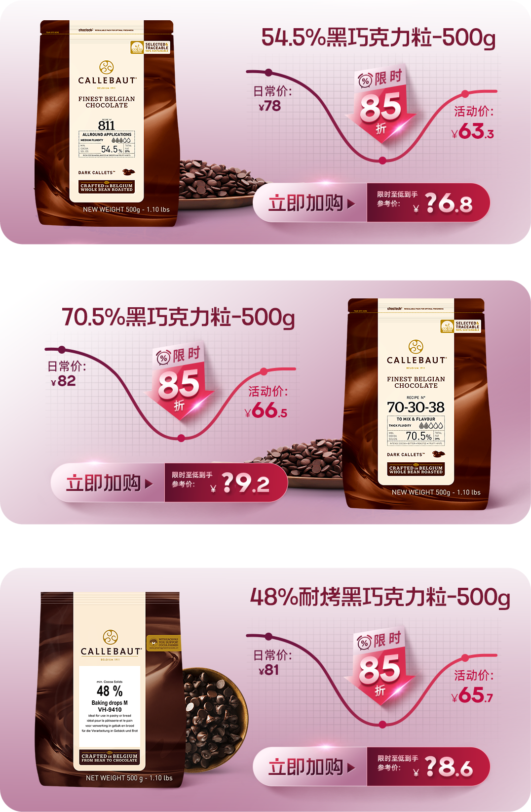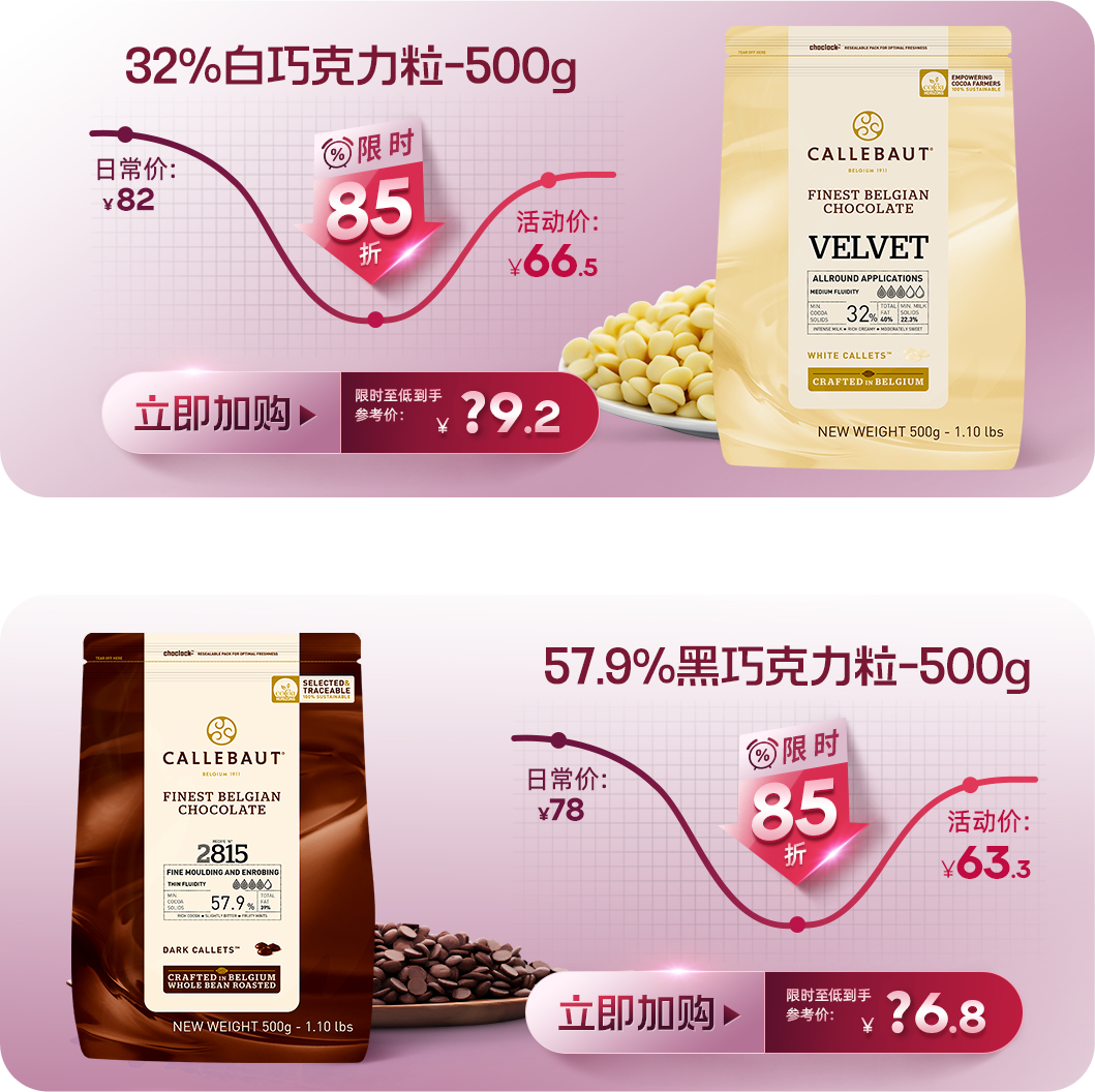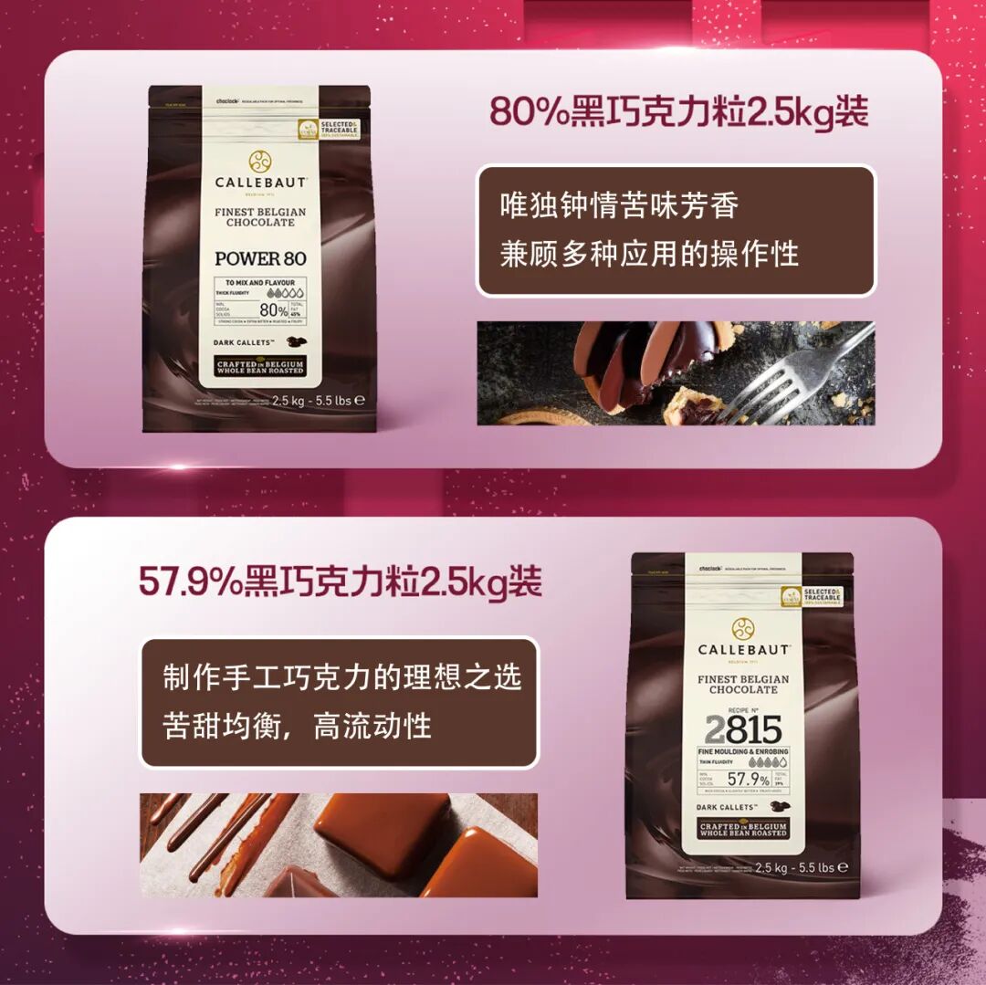 嘉利宝甄献多款超值单品,包含经典浓醇的黑巧克力、细腻清甜的白巧克力、馥郁香甜的牛奶巧克力、缤纷多彩的巧克力(黄金巧克力和红宝石巧克力)以及耐高温烘烤的巧克力产品、种类丰富,一应俱全。满载优惠福利,只为换新你舌尖上的浓醇至尊。