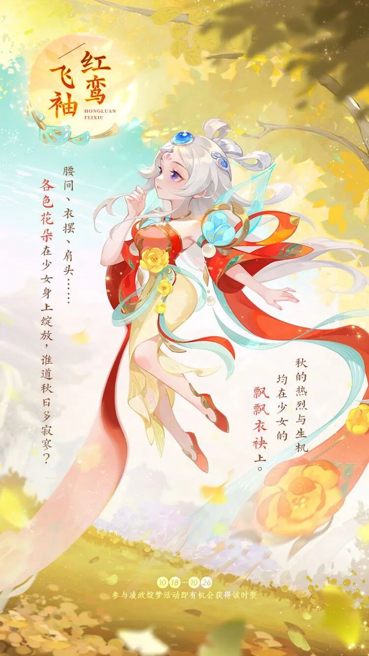 少女身穿金色的裙袍,红色的披帛随着微风飘动,宛如火焰般燃烧着,腰间的各色花朵,花瓣轻轻摇曳,微微泛着金色的光芒,与秋天的阳光相互辉映,散发出迷人的芳香。