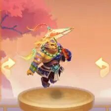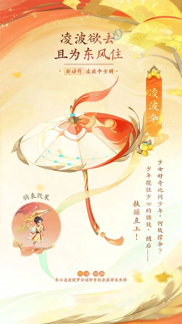 新动作凌波伞坐骑将金色和红色的瑰丽融为一体,伞面是温暖的金黄色,如同秋日的阳光洒满大地,给人一种温暖而富有生机的感觉。伞边勾勒着红色的花纹,如同枫叶在秋风中飘舞。
