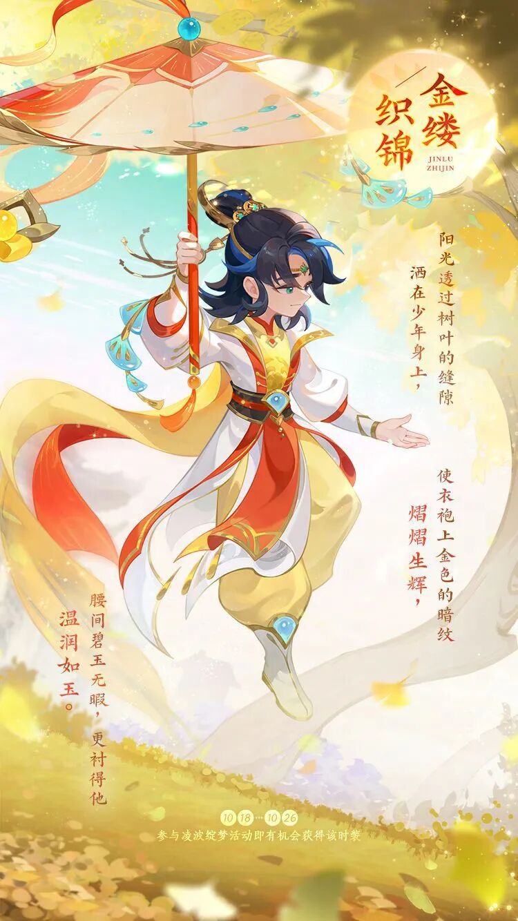 少年身穿金色的衣袍,红白交织的外衣映衬着他的热情,他衣袍上金色的暗纹熠熠生辉,这些暗纹交织在一起,给人一种华丽的氛围。他腰间佩戴着一块碧玉光洁无暇,更加凸显他温润如玉的气质。
