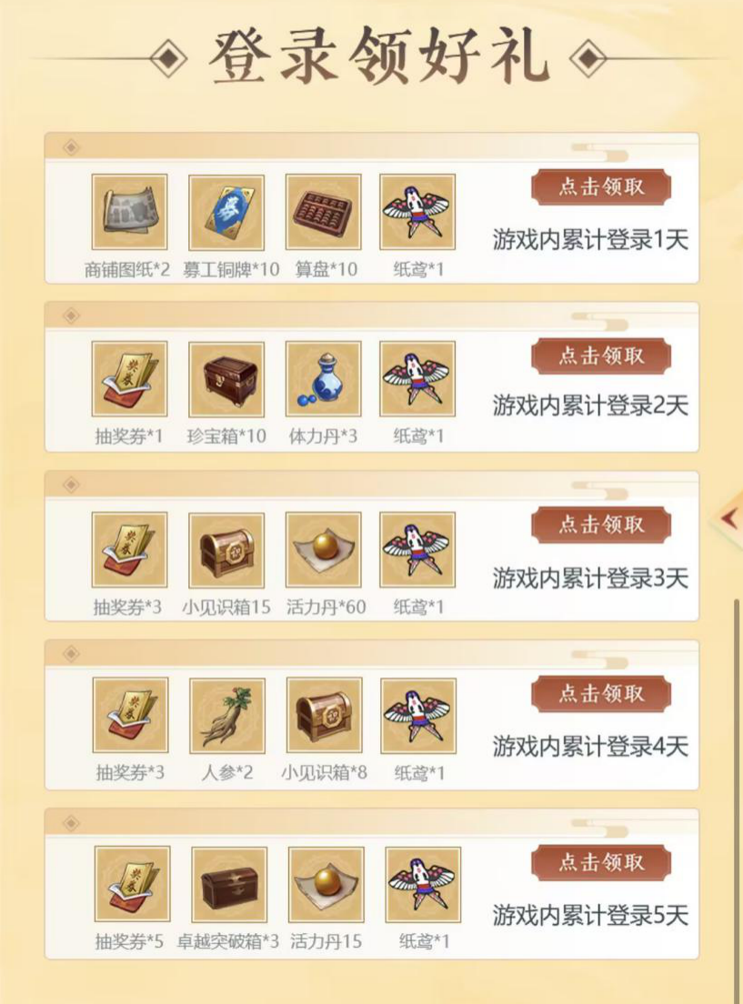 每日登录游戏即可前往活动界面,领取游戏内道具奖励及活动内抽奖道具“纸鸢”!