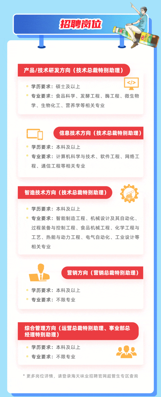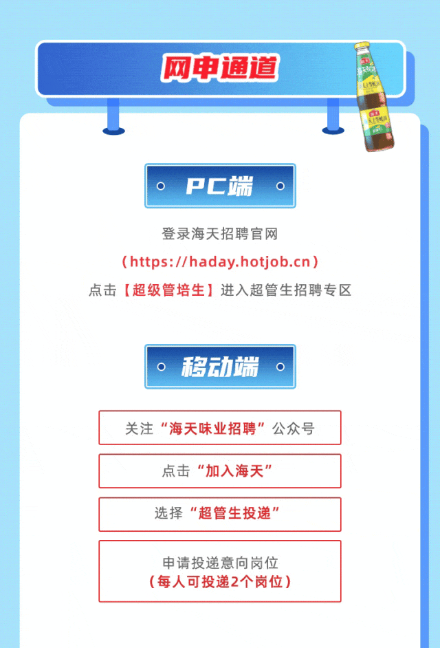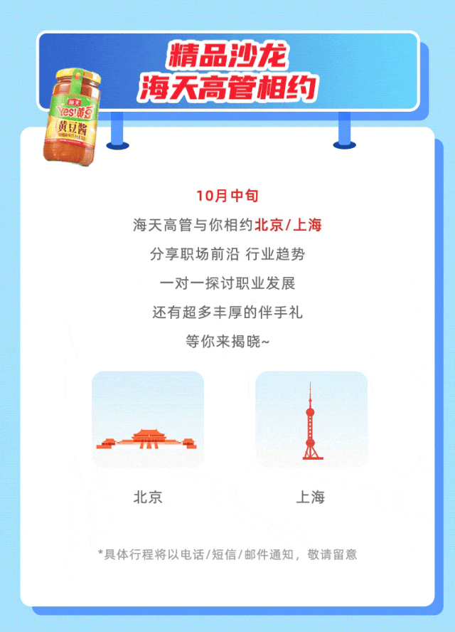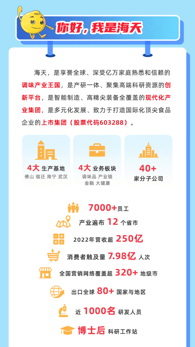 文章内容来源于公众号:海天味业招聘,点此可查看原文,内容版权归相关企业所有,本网站仅供交流学习。若涉及版权问题或存在侵权情况,请及时与我们联系,我们将第一时间进行删除处理。