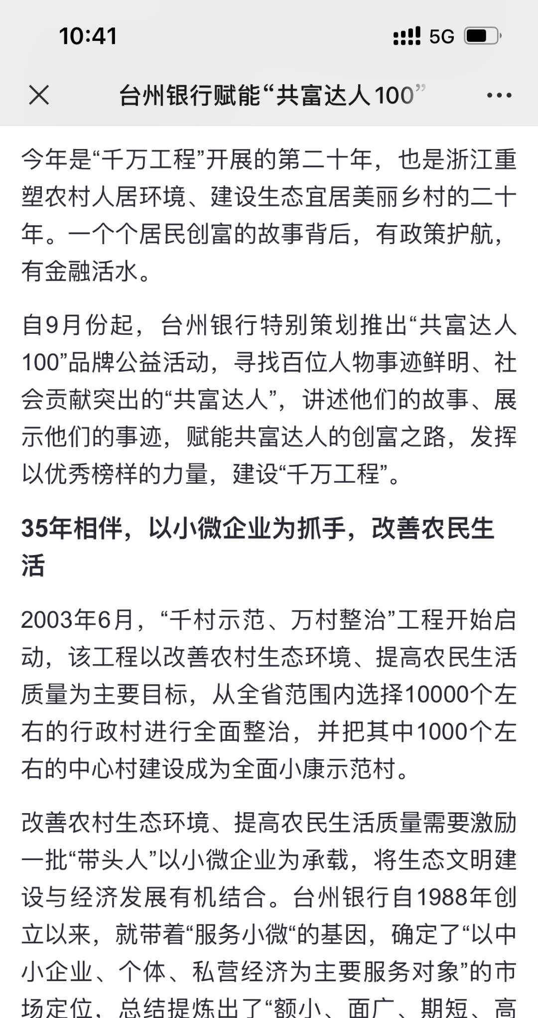 自9月份起,台州银行特别策划推出“共富达人100”品牌公益活动,寻找百位人物事迹鲜明、社会贡献突出的“共富达人”,讲述他们的故事、展示他们的事迹,赋能共富达人的创富之路,发挥以优秀榜样的力量,建设“千万工程”。