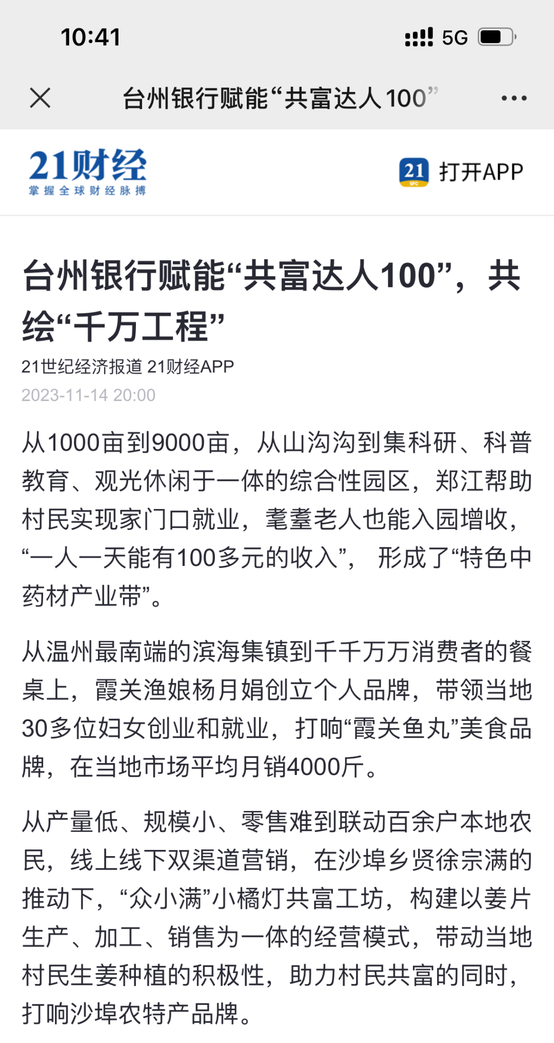 11月14日,《21世纪经济报道》刊登《台州银行赋能“共富达人100”,共绘“千万工程”》一文,报道了台州银行以小微企业为抓手,改善农民生活;以金融为载体,优化农村生态环境,并将在乡村振兴的道路上继续前进。