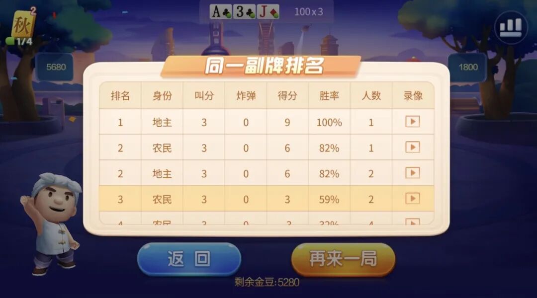 在每局结束后,点击右上角的图表按钮可以查看「同一副牌排名」。想知道自己的水平究竟如何?看看别人的发挥,取长补短,牌技才能更上一层楼!
