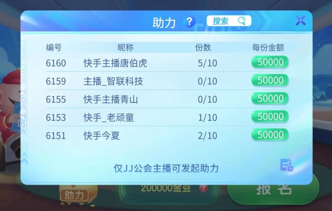 在某些赛场报名按钮的左侧,会有「助力」的“小金猪”。选择你喜爱的主播,参与助力,主播赢得比赛的奖励将按照助力比例进行分配。打牌累了的时候,看看直播,瓜分金币,何不是另一种乐趣呢~