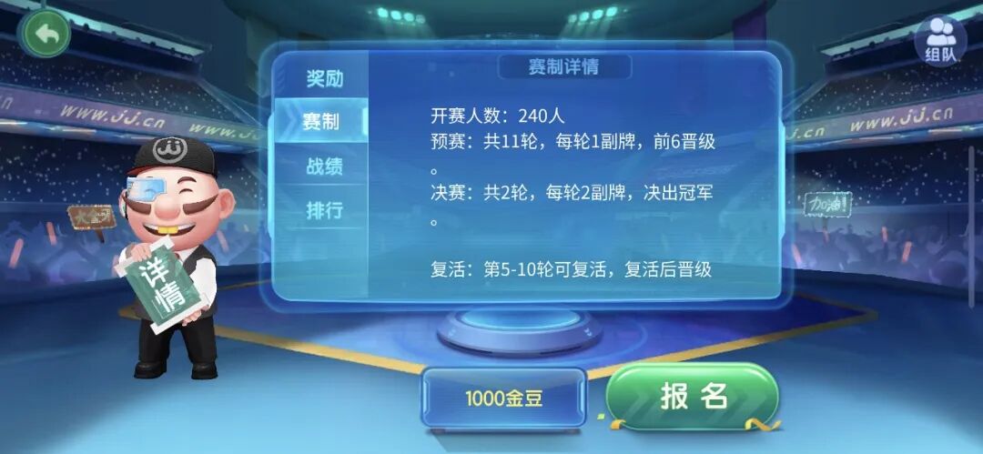 锦标赛(比赛场)的最大特色是你将在一场比赛中连打若干局,每结束一局后,将会根据输赢累计的积分决定你在本场比赛中的排名,而排名将决定你是否晋级下一轮的比拼。