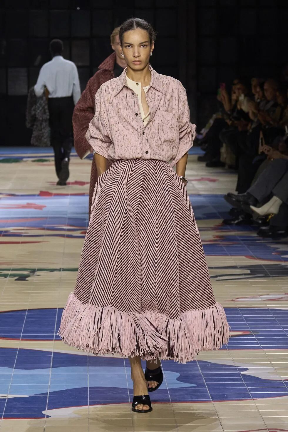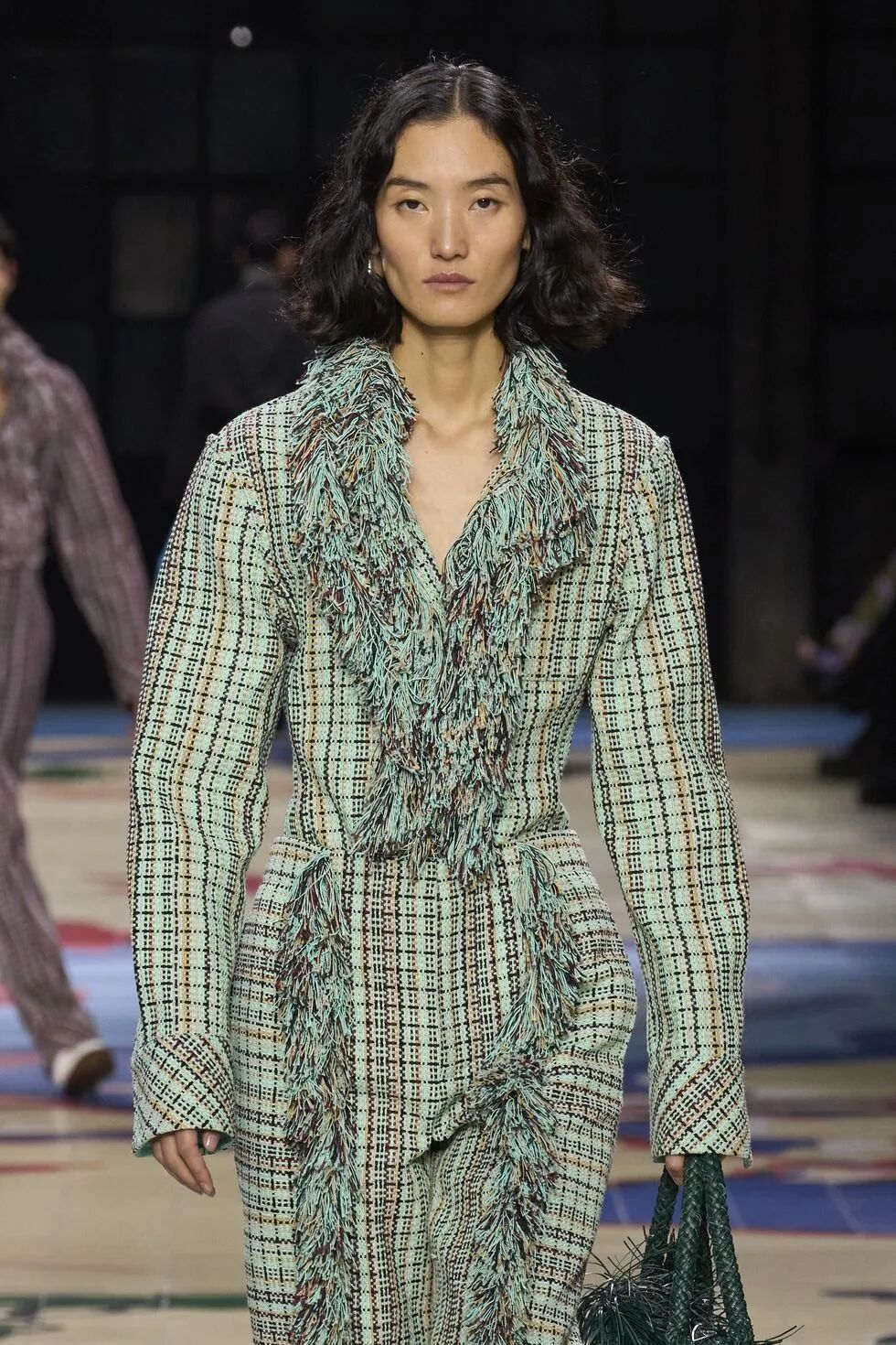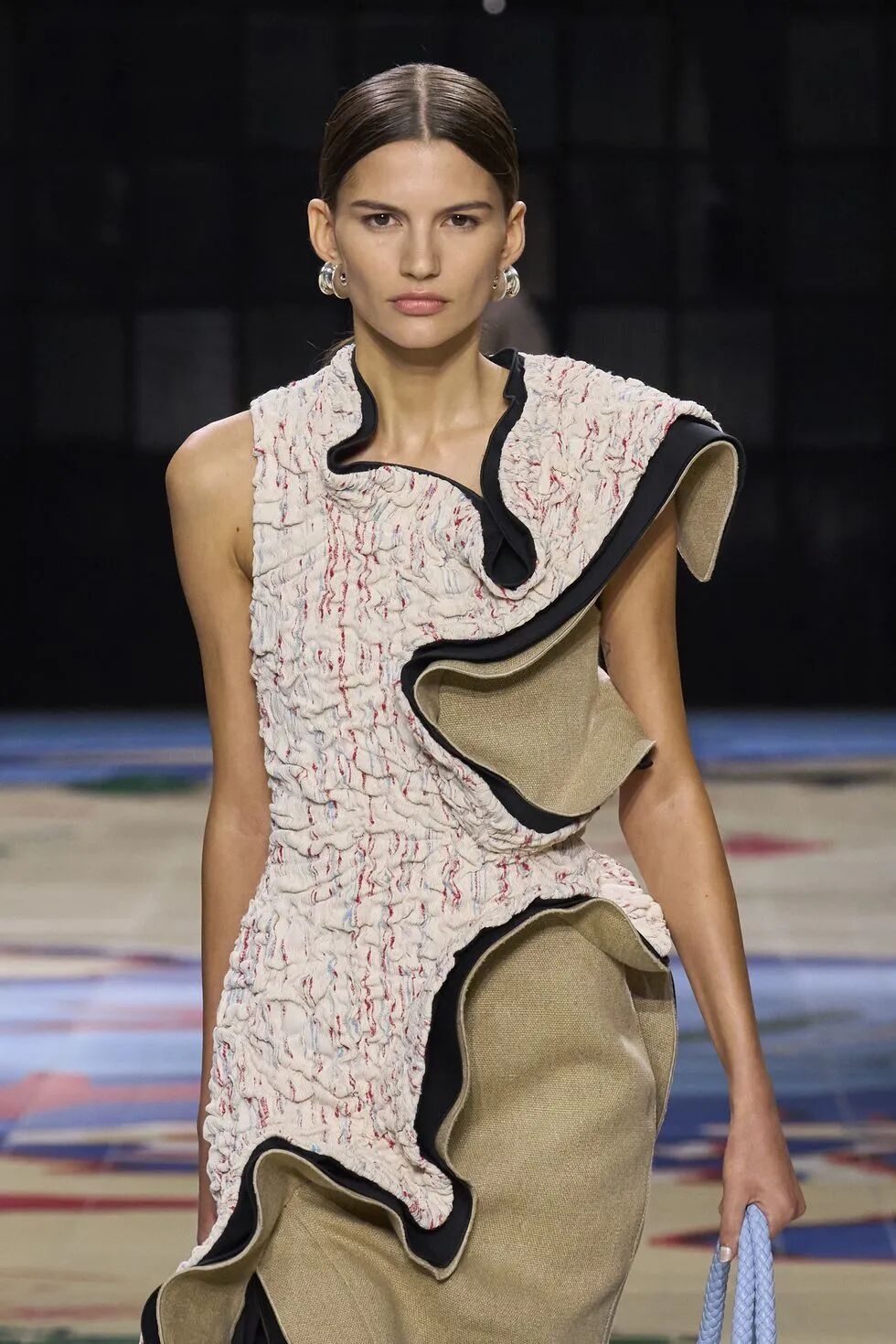 除了皮革外,麻料也是2024春夏的重点。麻料的织纹,由耗时的手工处理打造成如同流苏的流动线条。将过去几季主打的皮革流苏以更温润的语言展现而出。2024春夏系列之中,Matthieu Blazy还运用编织与缇花面料的织纹特质,打造出如同皮草的细致效果。以面料本身展现面料的多种表情,成为了Matthieu Blazy极具个人特色与展现其极致工艺的探索精神。