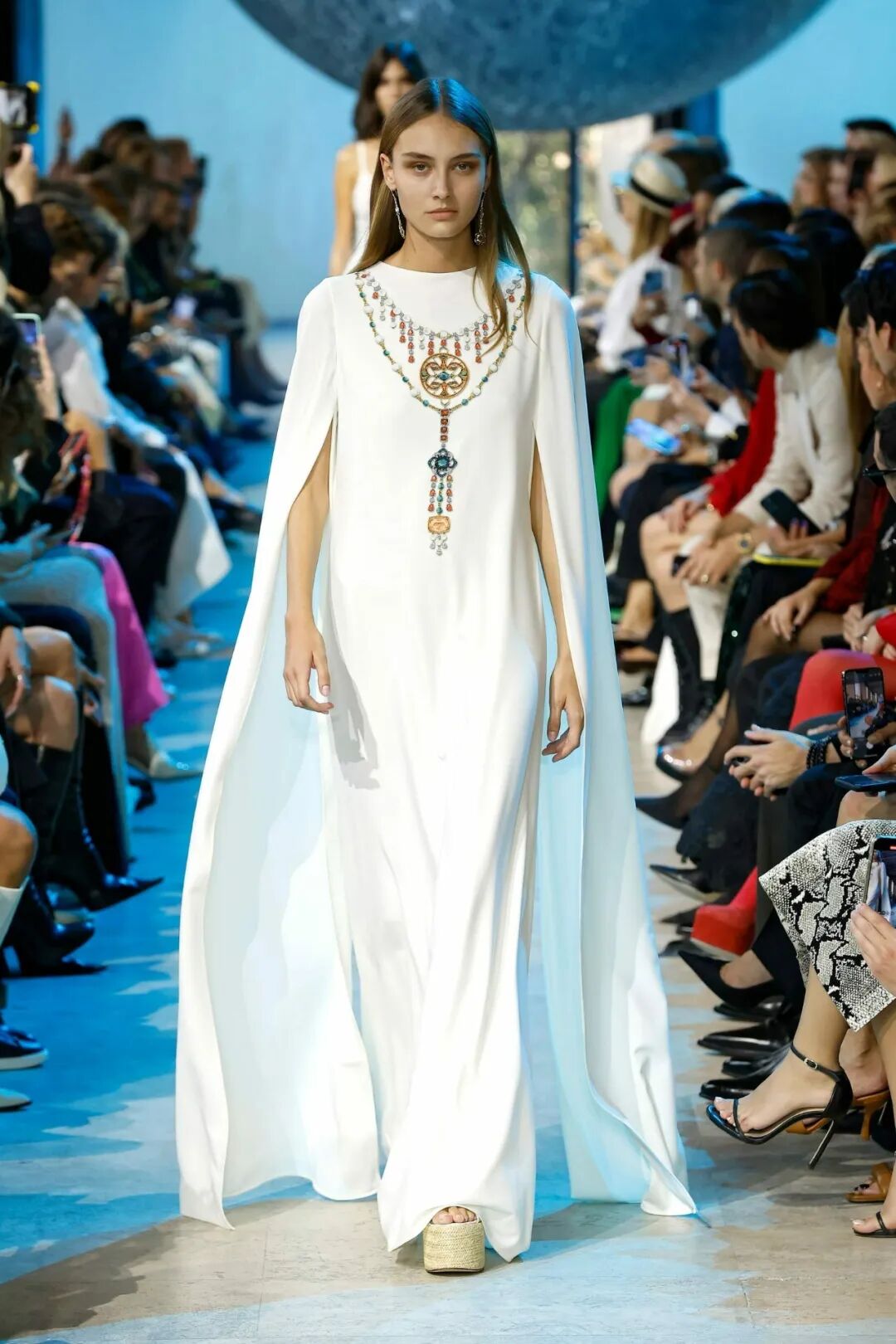 在其他地方,Elie Saab 选择了强烈的单色风格,推出了白色或“大都会粉色”的狩猎风格套装,以及刺绣薄纱的“珊瑚”连衣裙。一件原本质朴的白色斗篷连衣裙的前面,Elie Saab 以错视画的方式叠戴着项链,保持着属于品牌的克制。此外,Elie Saab 以刺绣、印花、蕾丝等细节出现,或者以闪闪发光的胸针固定在流畅的垂坠晚礼服上,就像月球那般,化具象为梦幻的抽象元素,反映了Elie Saab 在拥抱现代潮流的同时保持其独特审美的意愿。