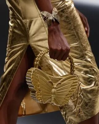 图案上,曾经出现在 TikTok 上著名的紧身上衣中的蝴蝶,现今作为中心图案回归,还有让人想起维多利亚的秘密的羽毛翅膀。模特们扮演慵懒、瘦长、英俊、长着翅膀的阿多尼斯,穿着低腰金色皮裤走在T台上,光滑、赤裸的躯干上撒满了闪光。天使与蝴蝶的结合营造出一种迷人的诱惑感。