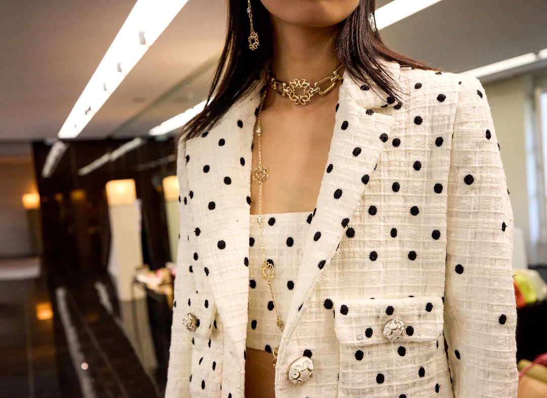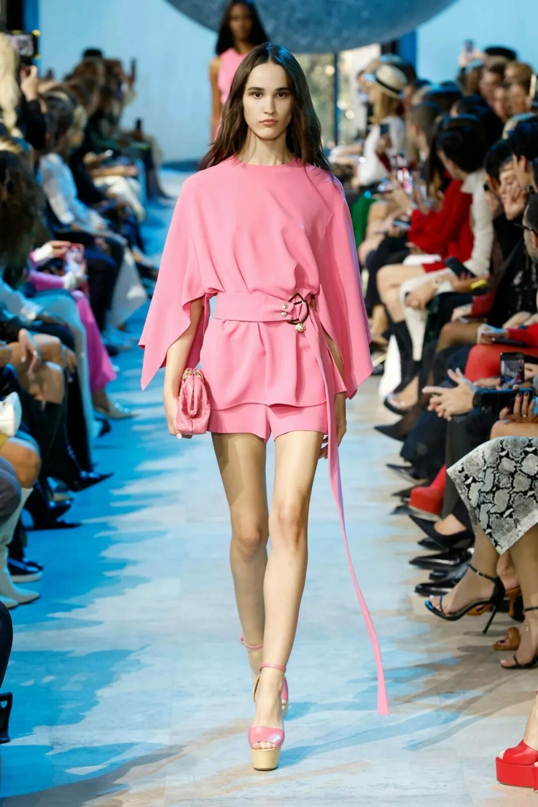 在秀场上,Elie Saab 采用了圆点图案作为主题形状。布料上,采用黑底白棉质府绸面料,或者采用夏季白色花呢的网格图案。圆形也出现在精致的流苏花边连衣裙上,以花瓣状的一半形式出现,并以鼠尾草绿和灰玫瑰色等强调色,与蕾丝拼接而成。或者作为一系列金属装饰的一部分,洒落在黑色小迷你裙上。或者是晚装上的“流星雨"图案。精巧的工艺在两件连衣裙上尤为明显——一件长,另一件短——似乎将月球地形转录成黄色、粉色和青铜色的贴花,绣在透明的底座上。