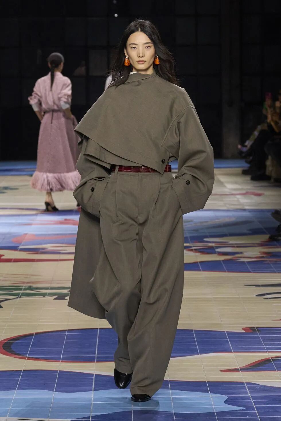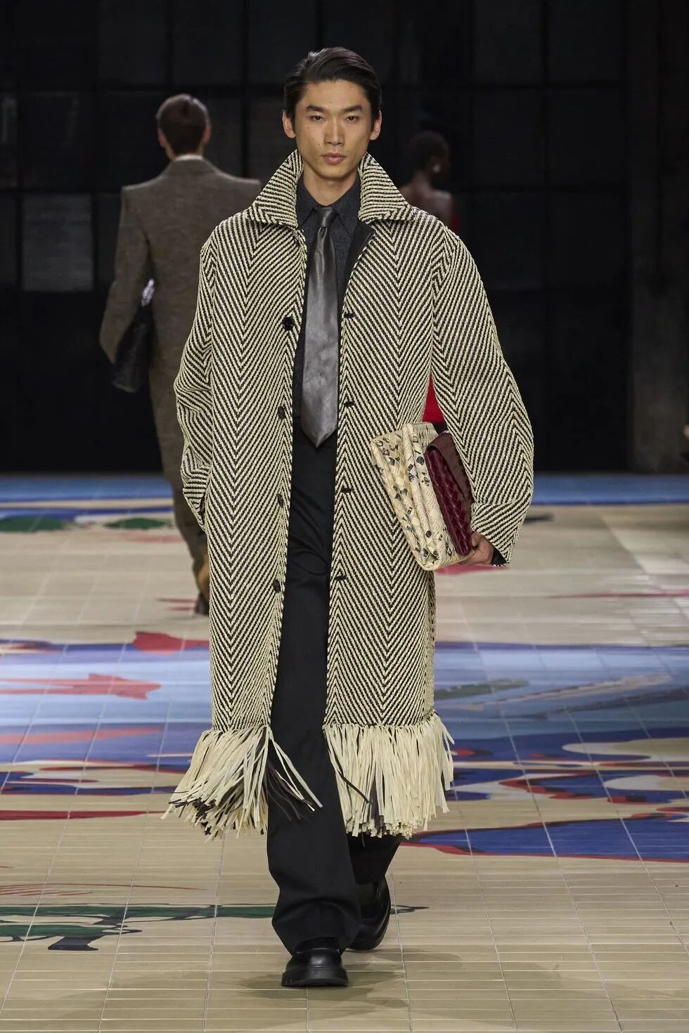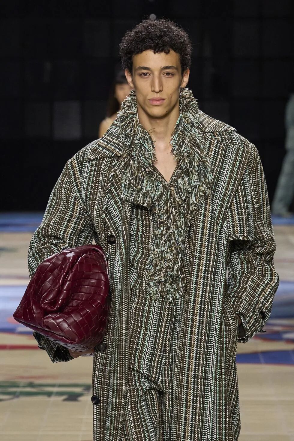 在开场的首套造型中,模特儿一身复古连体泳衣走上秀场,拎着由品牌经典Intrecciato编织皮革工艺制成的大「草编」包。这样的造型形式亦延伸入男装设计之中,而男模所背的则是巨大尺寸的水手背包。在这个充满旅行意涵的系列里,Matthieu Blazy以干净线条连身裤搭配夸张尺寸的包袋细节,打造出洗练但聚焦亮点的造型概念。