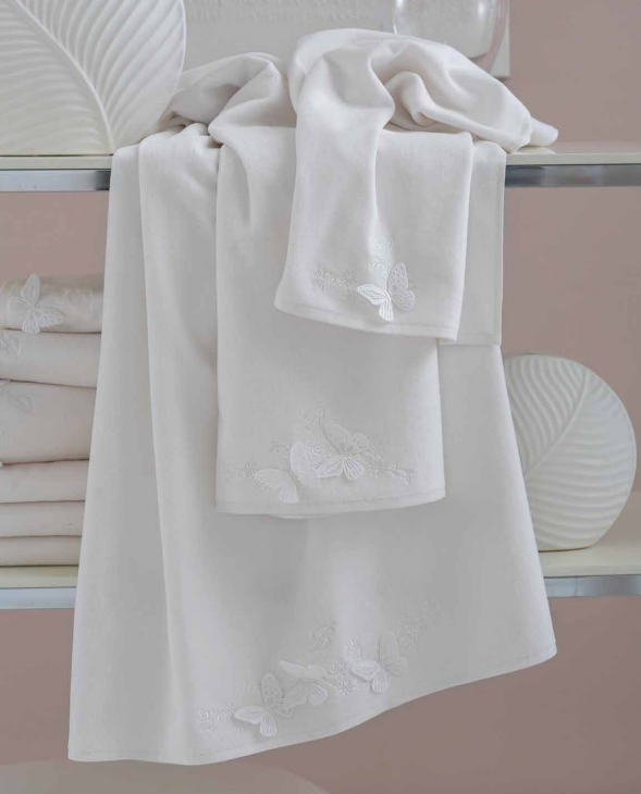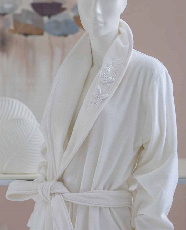 在最新出的浴室系列中,经典的蝴蝶绣多次在浴巾和浴袍之上。白蝴蝶是一种美丽而稀有的蝴蝶,"轻盈"地落在柔软的棉质面料之上,好像少女的一段仲夏夜之梦,纯洁梦幻。